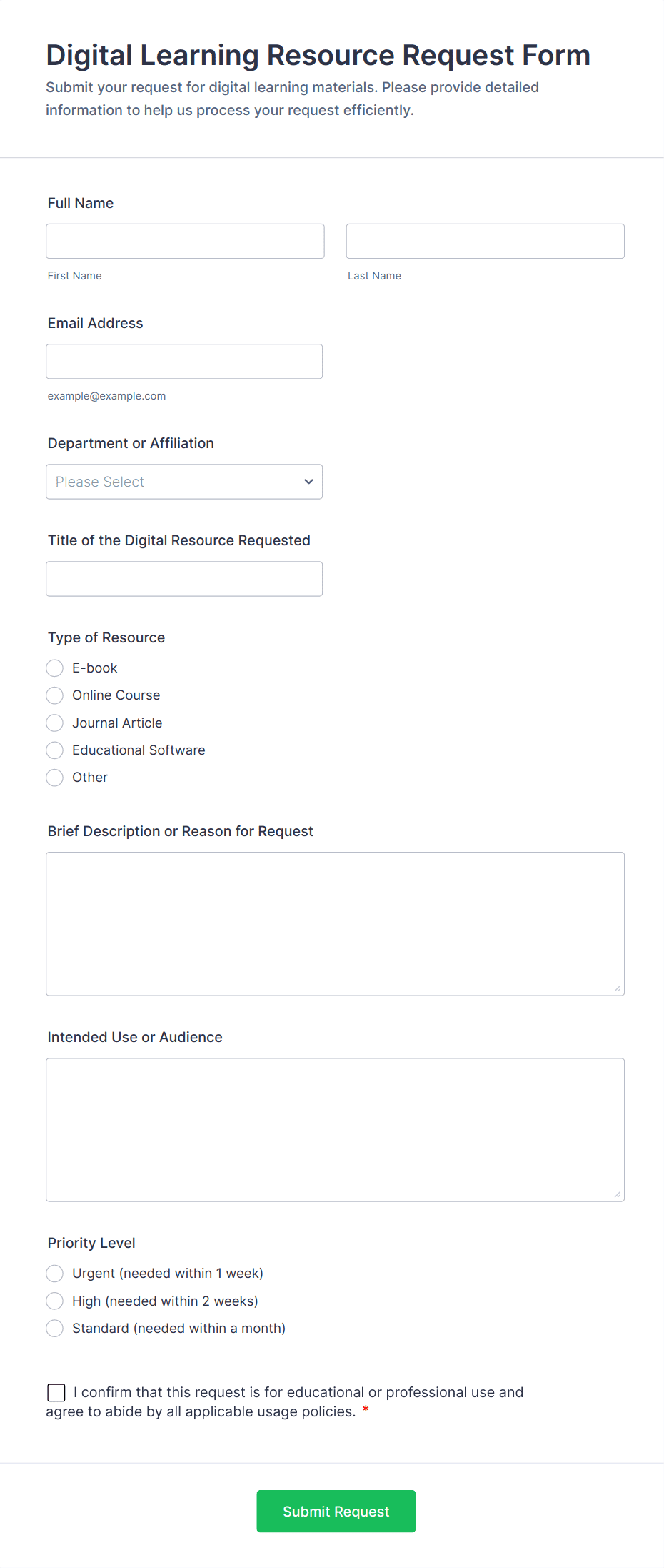 • Use conditional logic to show or hide fields based on the type of request selected. For example, if “Hardware Request” is chosen, display fields for device type and quantity; if “Technical Issue” is selected, show problem description and urgency.