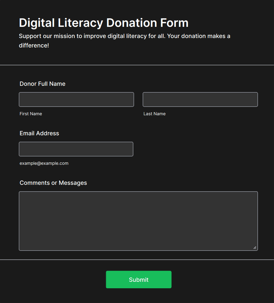 A donation form is an online tool used by organizations to collect monetary contributions from supporters, typically for charitable, nonprofit, or fundraising purposes.
