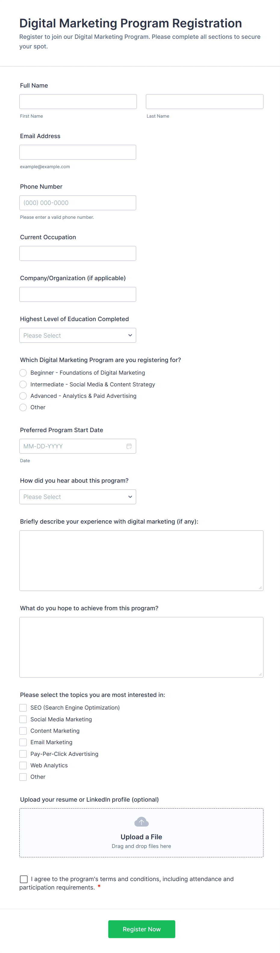 • Corporate Training: Collect employee ID, department, and supervisor approval.