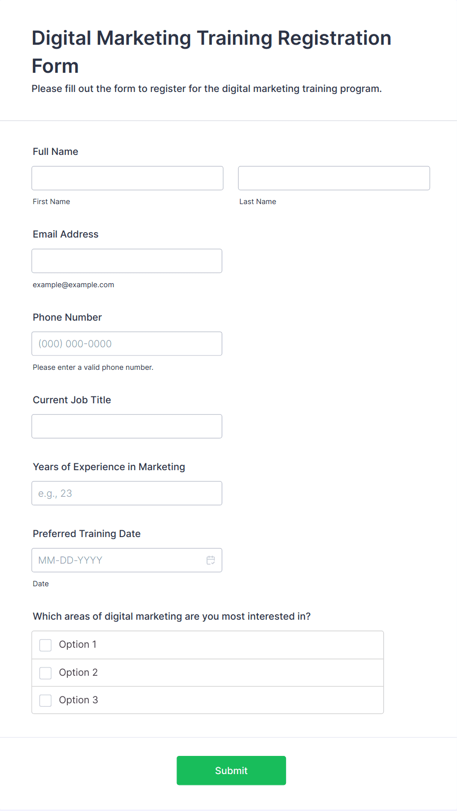 • Workshops and training sessions: Register participants, gather skill levels, and manage waitlists.