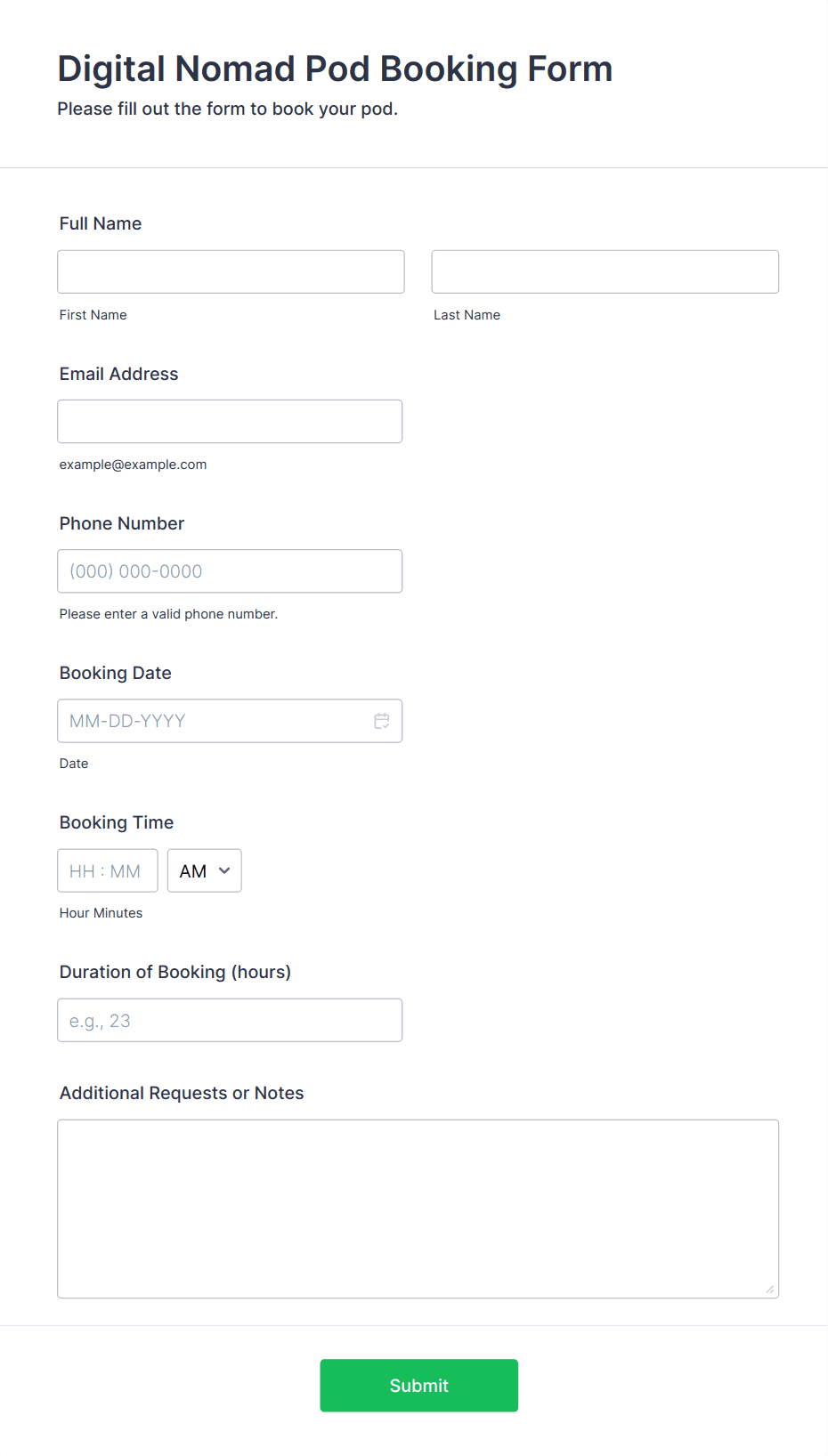 Booking forms are digital tools designed to streamline the process of scheduling appointments, reserving services, or booking resources. They are commonly used across a variety of industries, including hospitality, healthcare, education, event management, and personal services. Whether you’re managing hotel room reservations, client appointments, event registrations, or equipment rentals, booking forms help automate the intake of essential information, reduce manual errors, and ensure a smooth experience for both service providers and customers. Typical use cases include booking consultations, reserving meeting rooms, scheduling classes, or securing tickets for events.