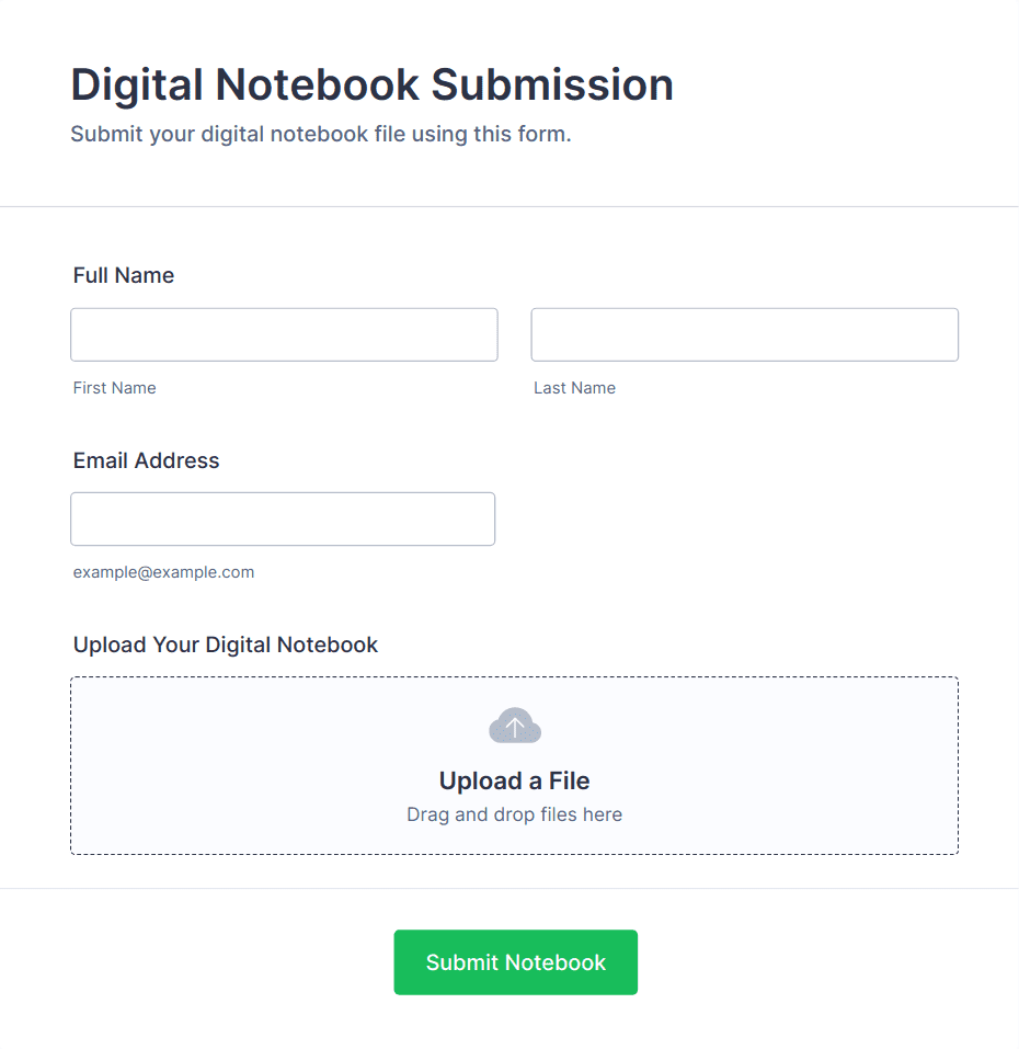 File Upload Forms are specialized online forms designed to collect files, documents, images, or other digital assets directly from users. These forms are commonly used in scenarios where individuals or organizations need to gather supporting materials, such as job applications with resumes, event registrations with ID proofs, homework submissions, design requests, or client onboarding documents. The versatility of File Upload Forms makes them essential for businesses, educational institutions, creative agencies, HR departments, and service providers who require a secure and efficient way to receive files from clients, students, or collaborators.