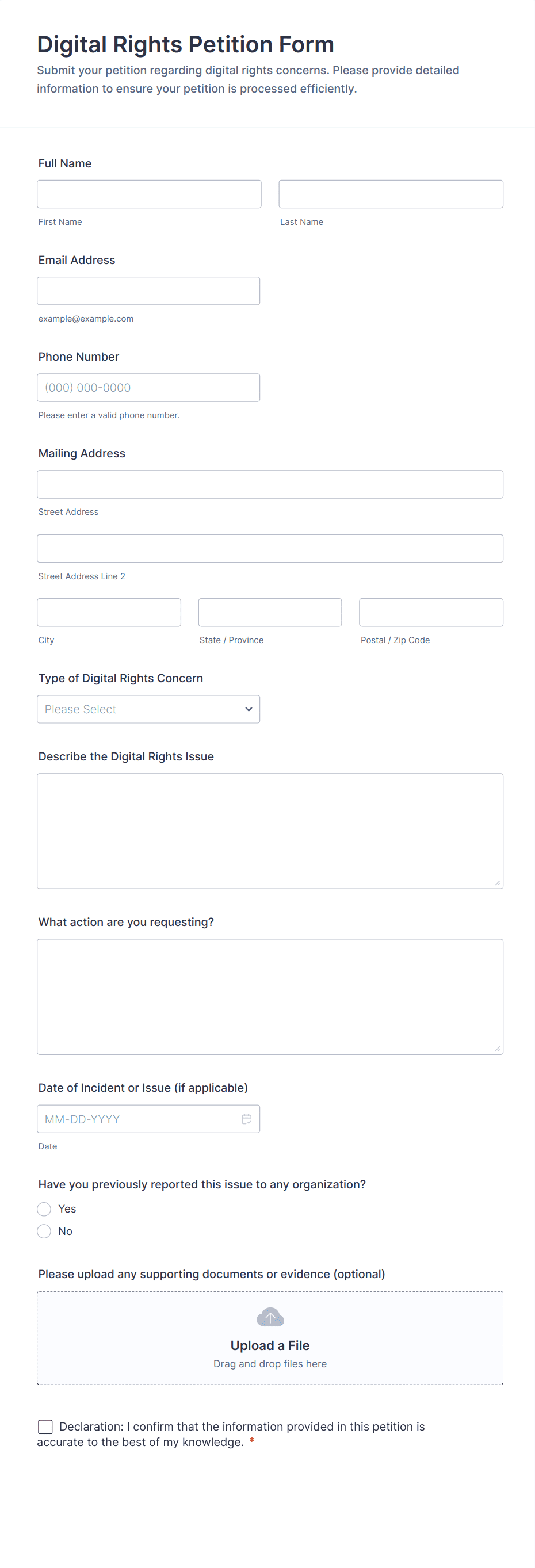 An Online Petition is a form template designed to mobilize support, raise awareness, or advocate for a particular cause, issue, or action.
