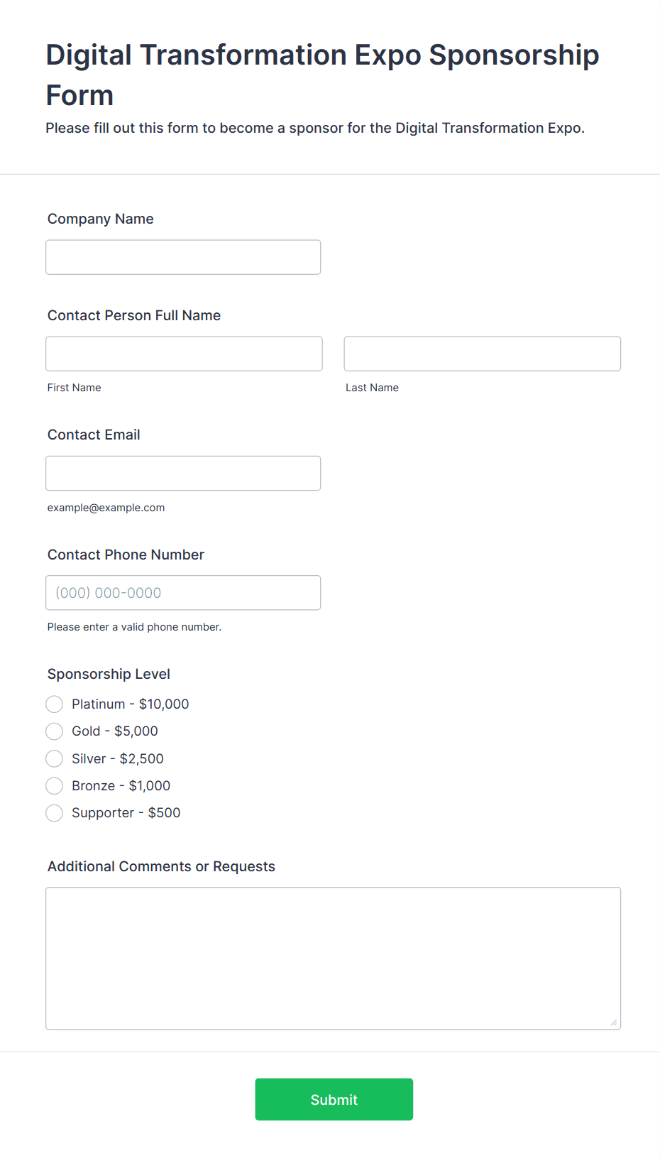 A sponsorship form is a document or online form used to collect information and commitments from individuals or organizations willing to support an event, project, or cause financially or through in-kind contributions.