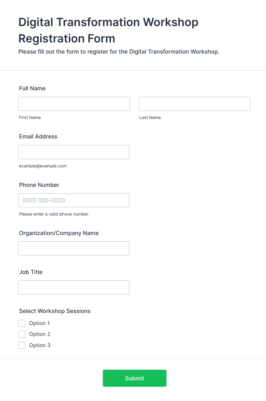 A Workshop Registration Form Template is a pre-designed online form that helps organizers collect participant information, preferences, and payments for workshops or training events.