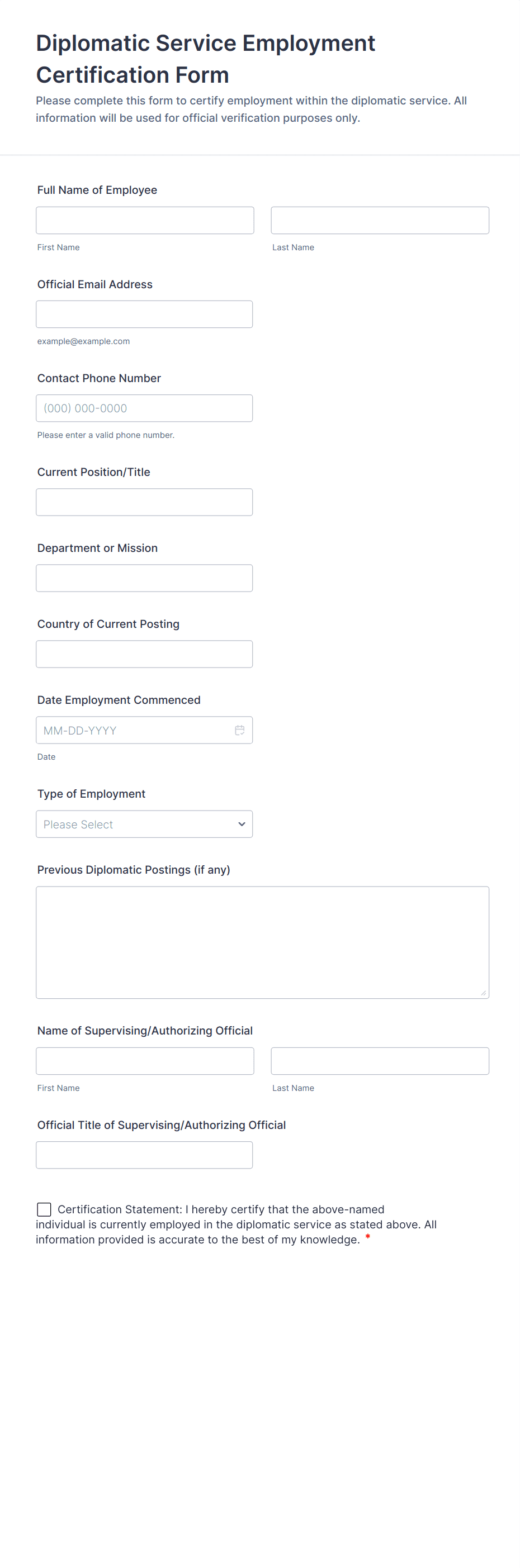Verification forms are specialized digital tools designed to authenticate, validate, or confirm information provided by individuals or organizations. These forms are commonly used to verify identities, credentials, employment status, addresses, or other critical data points in a secure and efficient manner. Typical use cases include onboarding new employees, confirming student enrollment, validating customer identities for financial services, or ensuring the accuracy of submitted documents in compliance processes. By streamlining the verification process, these forms help organizations reduce fraud, maintain regulatory compliance, and build trust with their stakeholders.