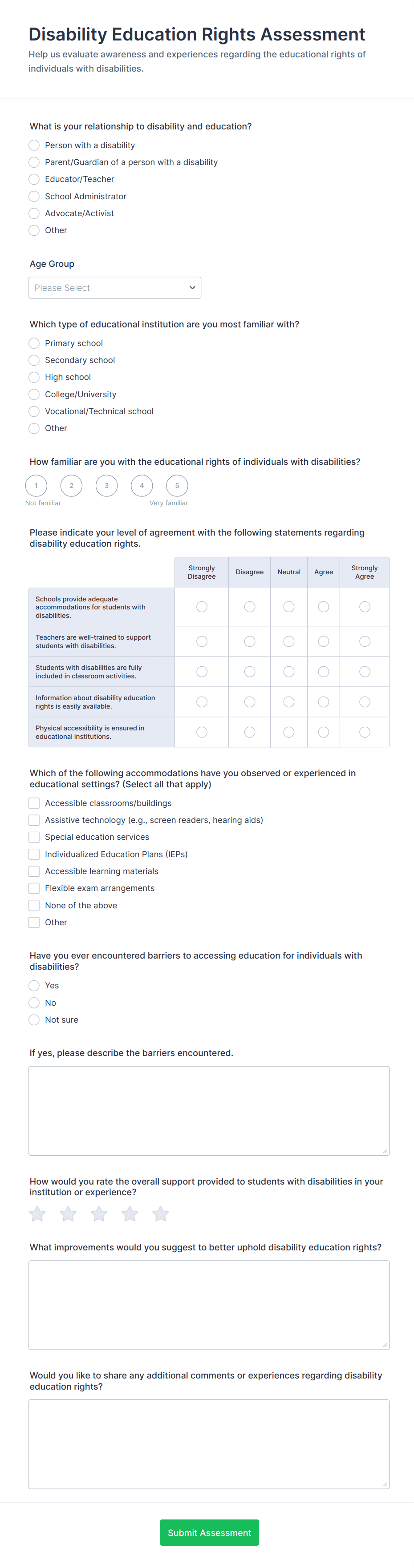 Assistive Technology Solutions Assessment Form Template for Jotform helps teams collect assessment requests and prepare recommendations for assistive technology needs across home, school, or work settings.