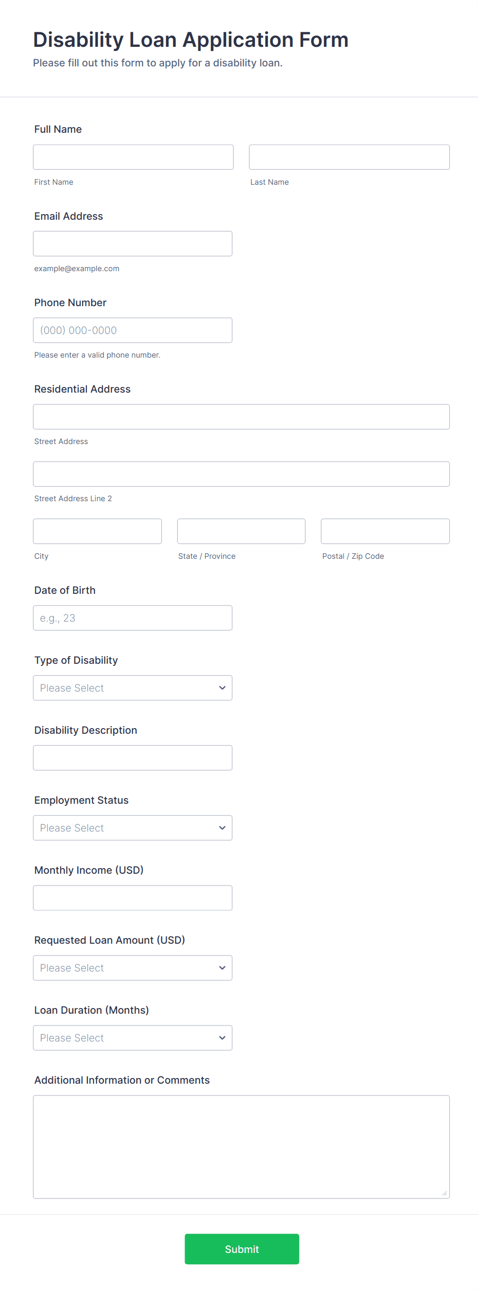 - File upload fields for supporting documents (e.g., pay stubs, tax returns, business plans)