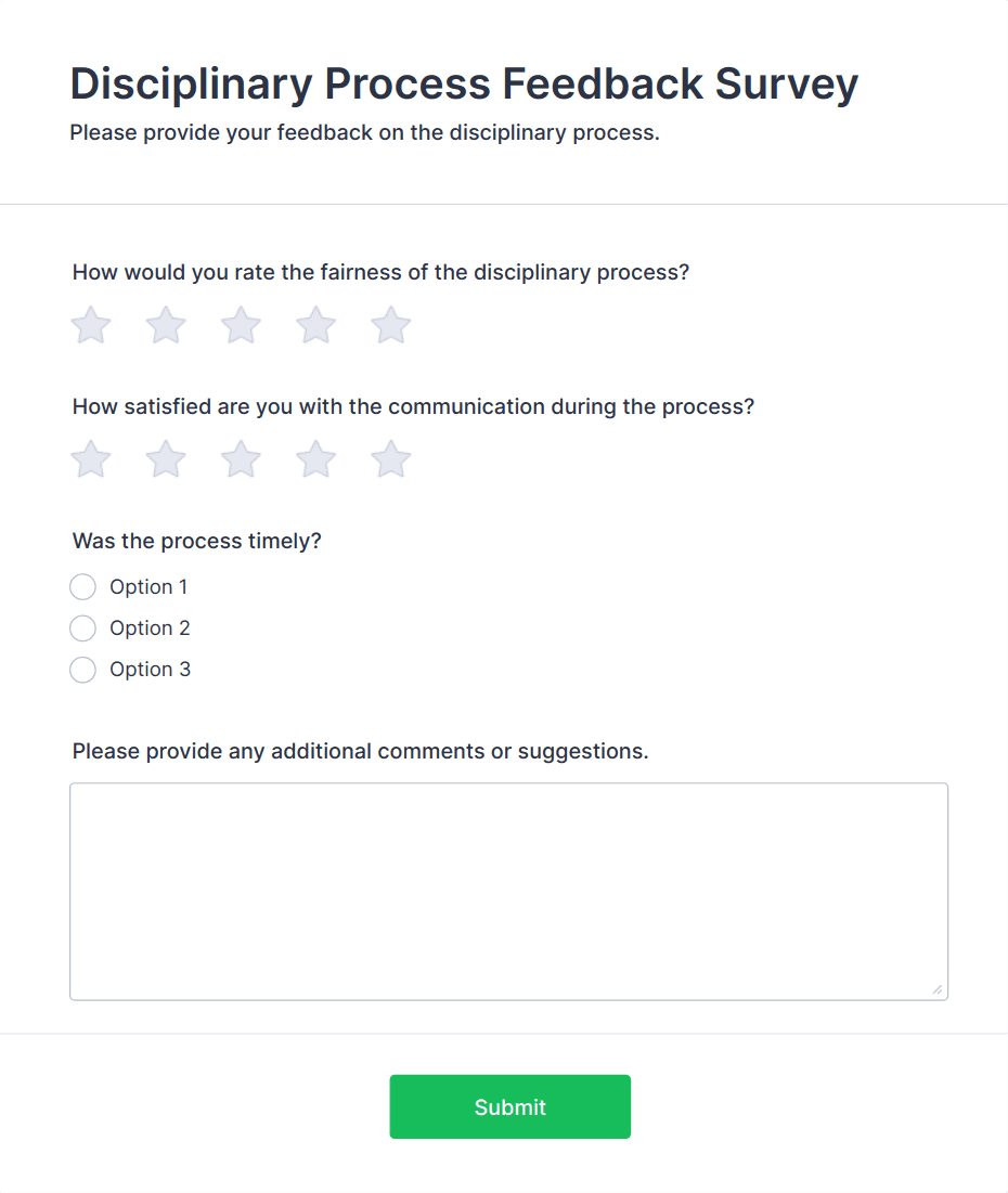 • Employee feedback forms for performance reviews or workplace improvement