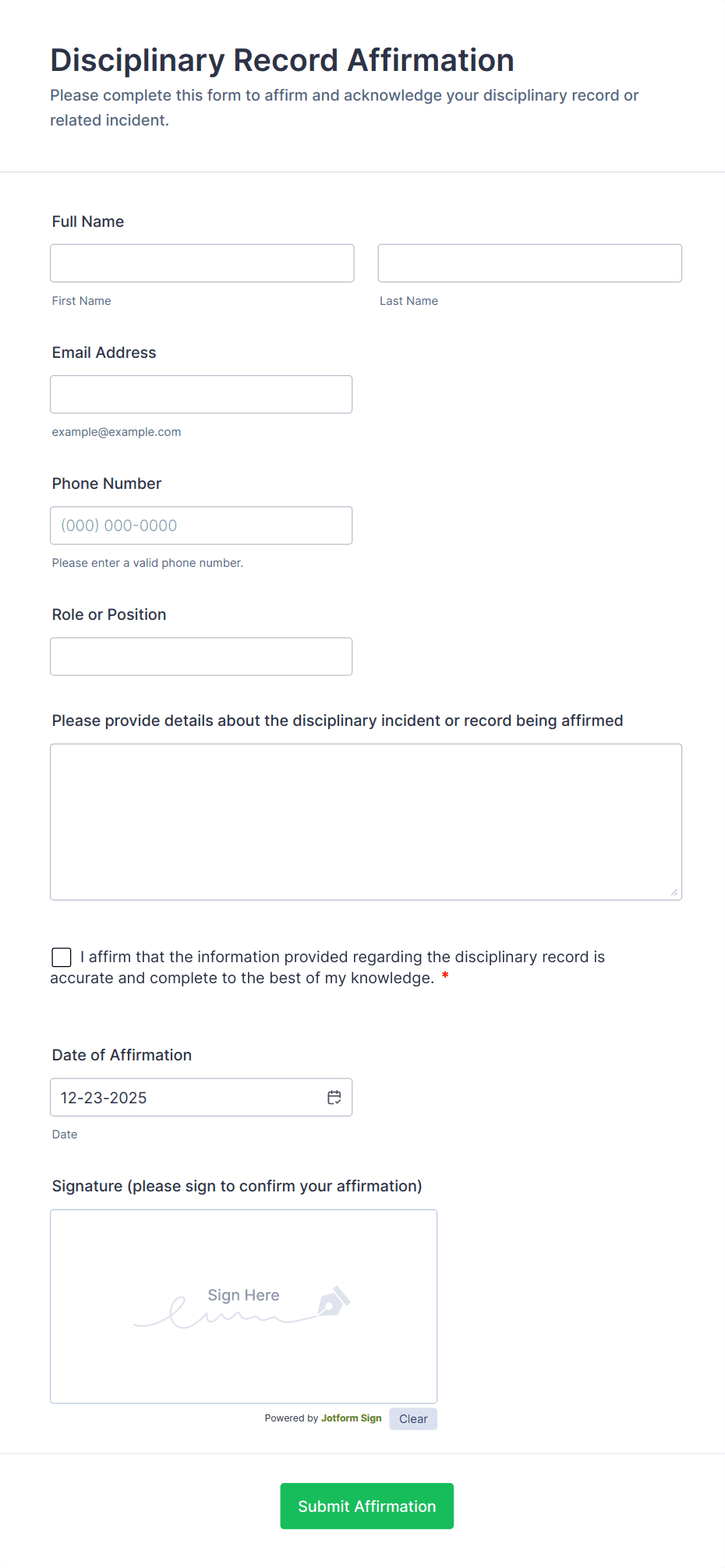 Disciplinary forms are used by employers or HR departments to make reports of complaints, warnings, or disciplinary actions. Using these ready-made form templates from Jotform, your company can make the switch from messy paper forms to powerful online disciplinary forms that can be filled out on any device and securely stored in your Jotform account.