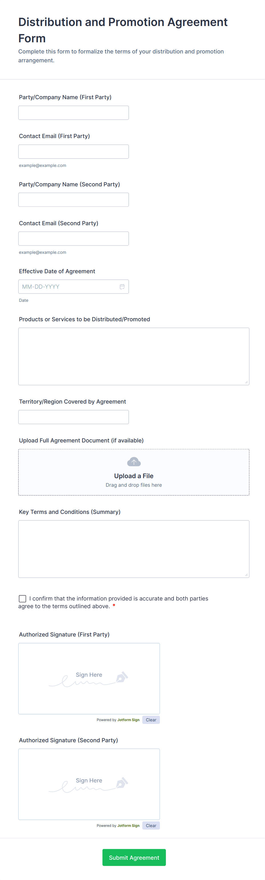 The form templates here are for informational purposes only. Jotform is not providing legal, financial, or other advice, or implying that the forms are legally valid in all or any jurisdictions. Before using any such form, consult an attorney and/or other applicable professionals to make sure that the form meets your needs, legally and otherwise.