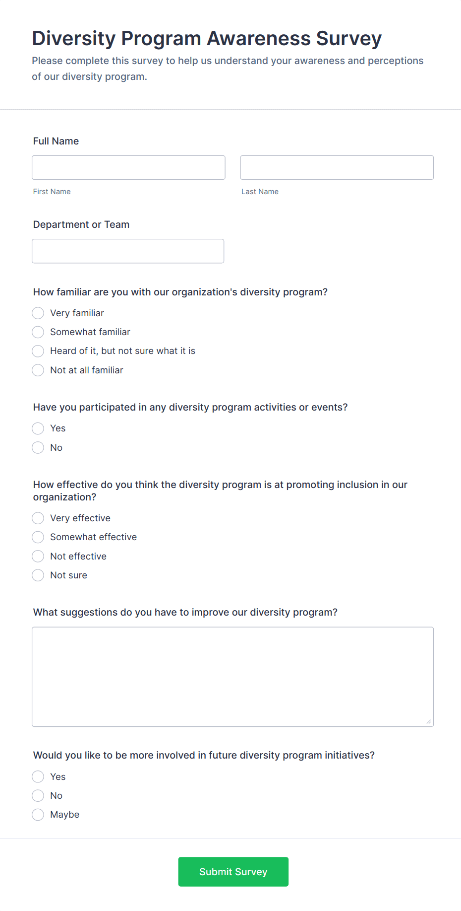 Employee Survey Templates are pre-designed forms that organizations use to gather feedback, opinions, and insights from their workforce. These templates cover a wide range of topics, including job satisfaction, workplace culture, employee engagement, training needs, performance evaluations, and more. By using employee survey templates, HR professionals, managers, and business owners can efficiently collect valuable data to understand employee sentiment, identify areas for improvement, and make informed decisions that enhance workplace productivity and morale. Common use cases include onboarding feedback, exit interviews, pulse surveys, annual engagement surveys, and 360-degree feedback.