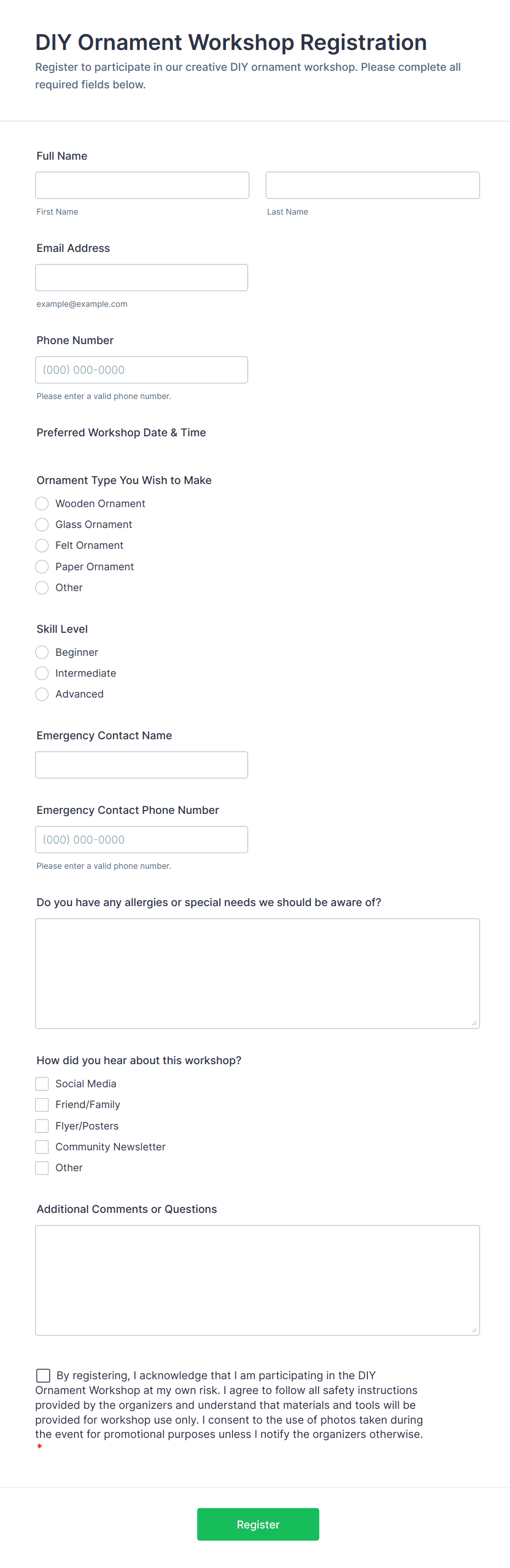 3. What information should be included in a workshop registration form?