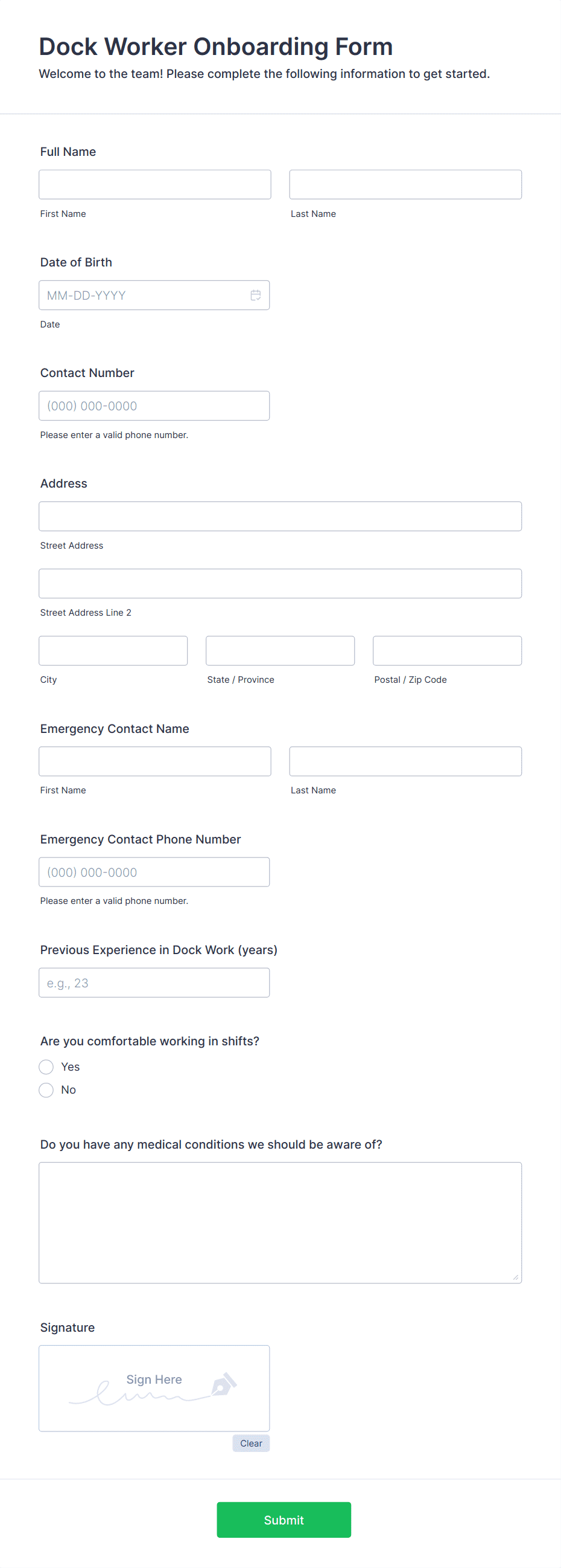 Onboarding Form Templates are specialized digital forms designed to streamline the process of integrating new employees, clients, students, or members into an organization or program. These templates help collect essential information, set expectations, and ensure a smooth transition for newcomers. Common use cases include employee onboarding, client intake, volunteer registration, student enrollment, and vendor onboarding. By standardizing the onboarding process, these forms help organizations gather necessary data, provide important resources, and establish clear communication from the very beginning.