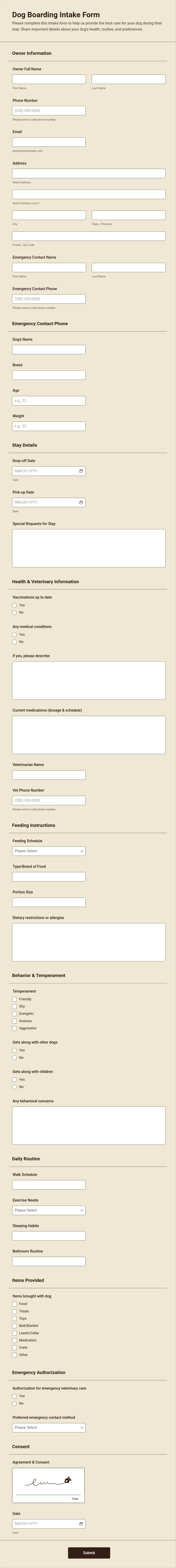 Intake forms are essential tools used to gather preliminary information from clients, patients, customers, or participants before providing a service or beginning a process. These forms streamline the onboarding process by collecting relevant details such as contact information, background data, preferences, and specific needs. Intake forms are widely used across various industries, including healthcare (patient intake), legal (client intake), education (student intake), human resources (employee onboarding), and service-based businesses (client consultations). By standardizing the information-gathering process, intake forms help organizations ensure consistency, improve efficiency, and deliver personalized experiences.