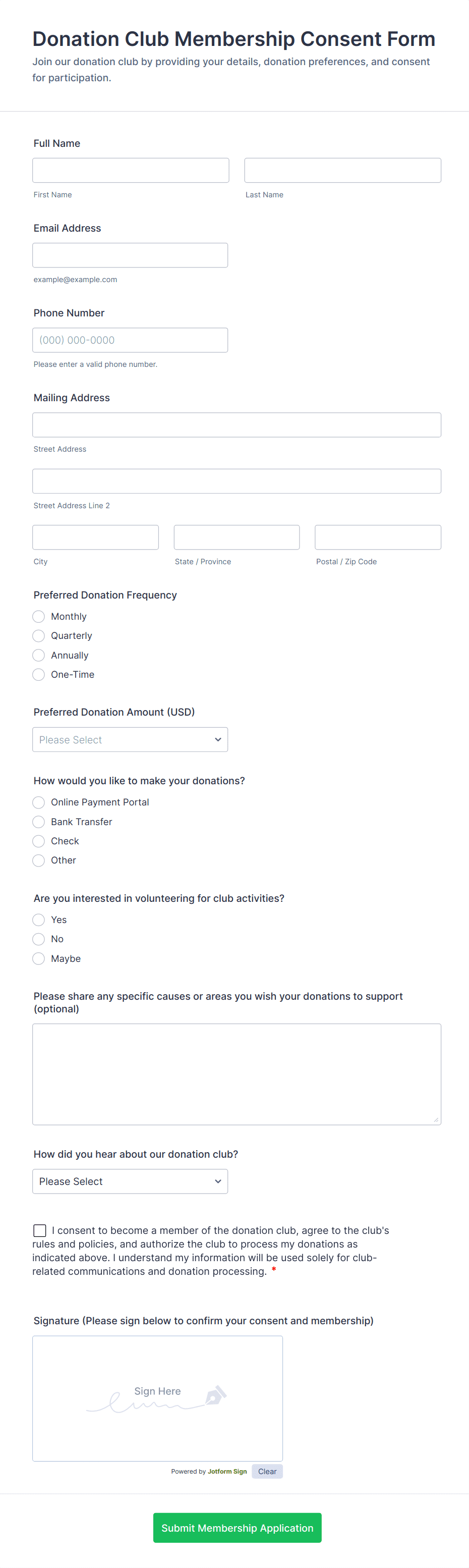 With Jotform, creating and managing consent forms becomes a seamless process. Jotform’s no-code Form Builder allows users to quickly design custom consent forms tailored to their specific needs, whether for patient intake, parental permissions, or data processing agreements. The drag-and-drop interface, customizable templates, and integration with secure storage and notification systems make it easy to collect, organize, and access consent responses. By leveraging Jotform’s advanced features, users can ensure compliance, streamline workflows, and provide a professional experience for both organizations and respondents.