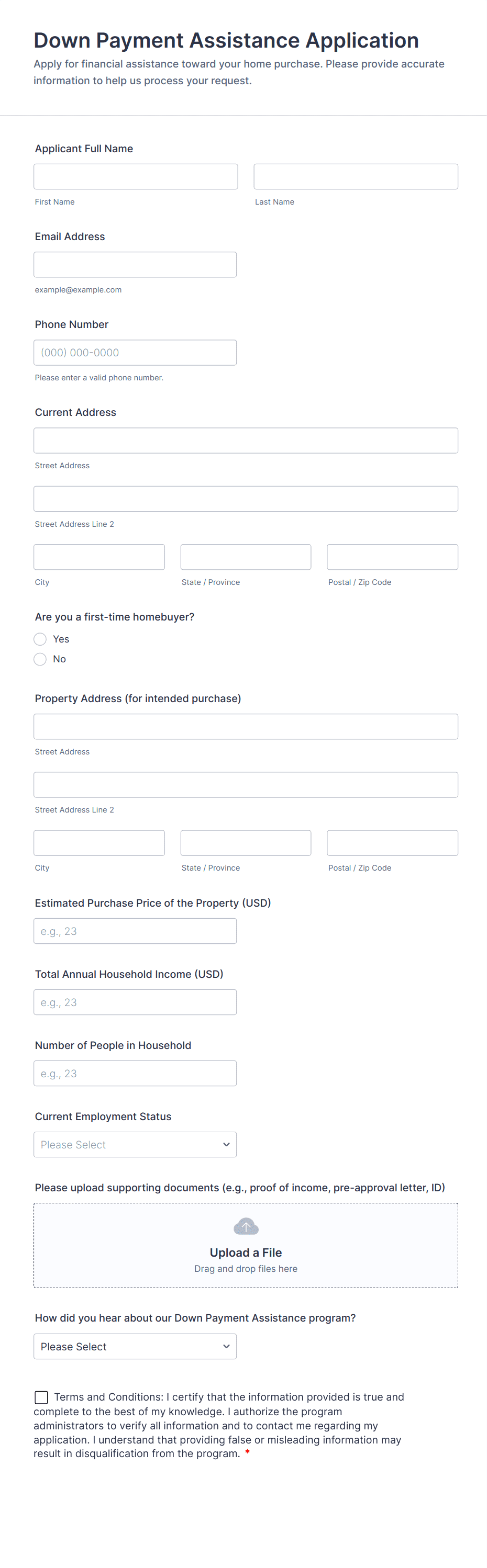 • File upload fields for supporting documents (e.g., pay stubs, tax returns, business plans)