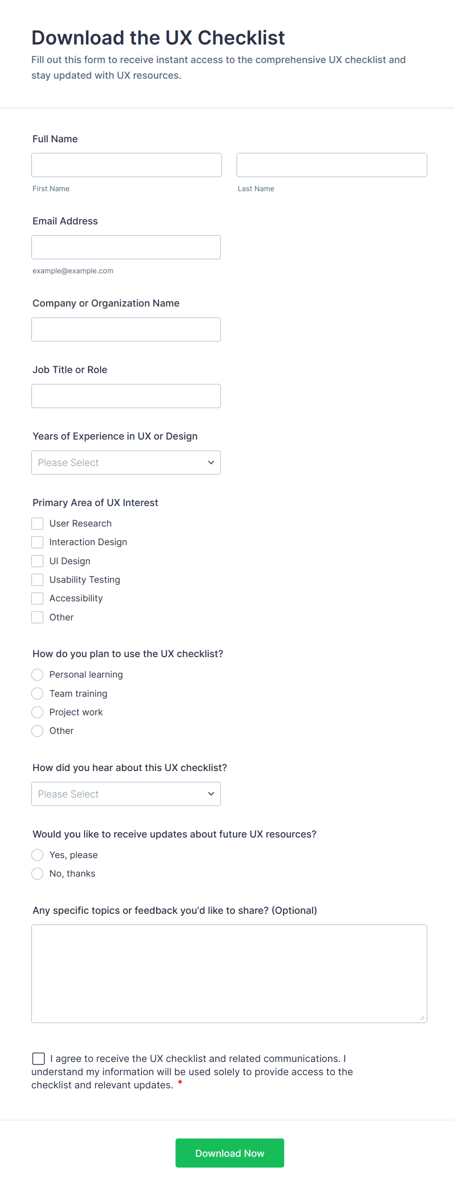 • Newsletter Sign Up: Typically requires only name and email, with optional interest checkboxes.