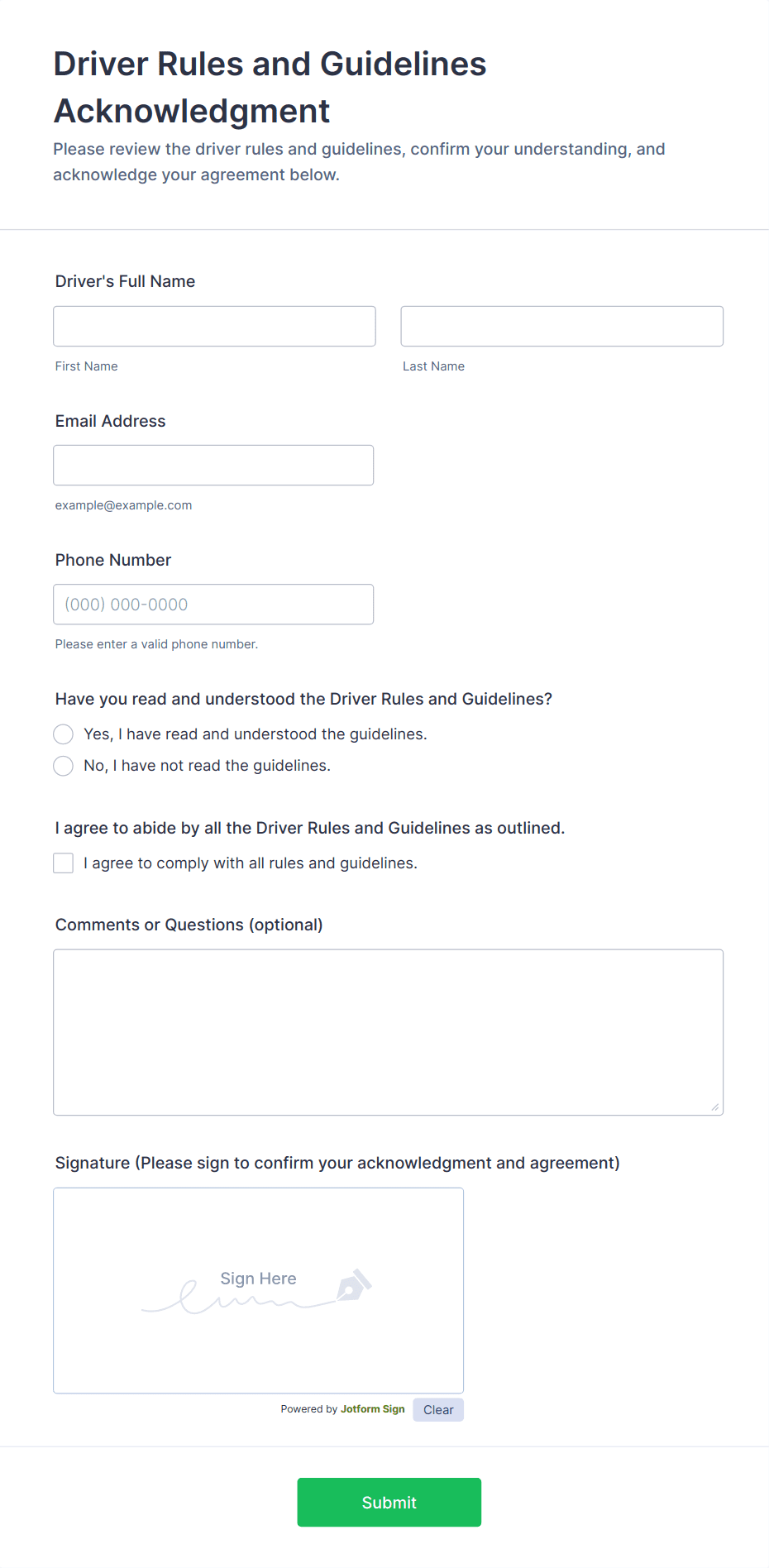 Need a form that keeps up with your transportation business? Try Jotform’s free Driver Forms to organize driver applications, vehicle inspections, and feedback forms in one central place. Pick a template that works for you and start customizing your form by choosing your own logo, fonts and colors, and integrating with 100+ third-party platforms. Our drag-and-drop builder makes it easy to design a form that fits your business. Send out your completed form to your drivers and clients, or embed it in your website for quick access. Take your forms on the road with powerful Driver Forms from Jotform.