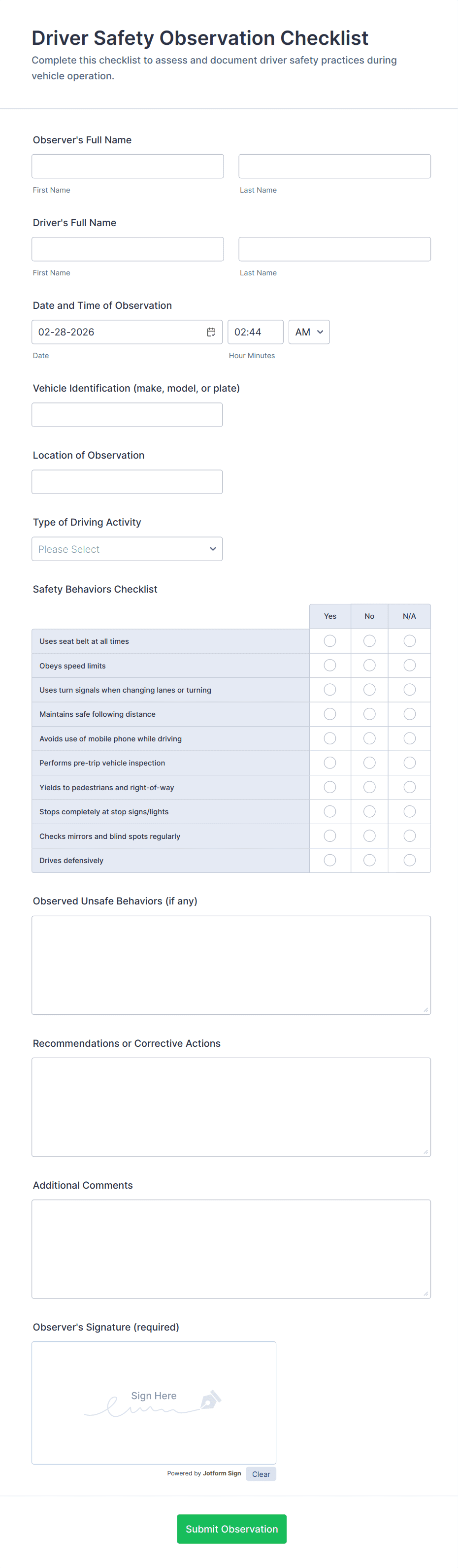 • Conditional Logic: Some forms may use conditional fields to display additional questions based on previous answers (e.g., if a hazard is found, prompt for corrective action details).