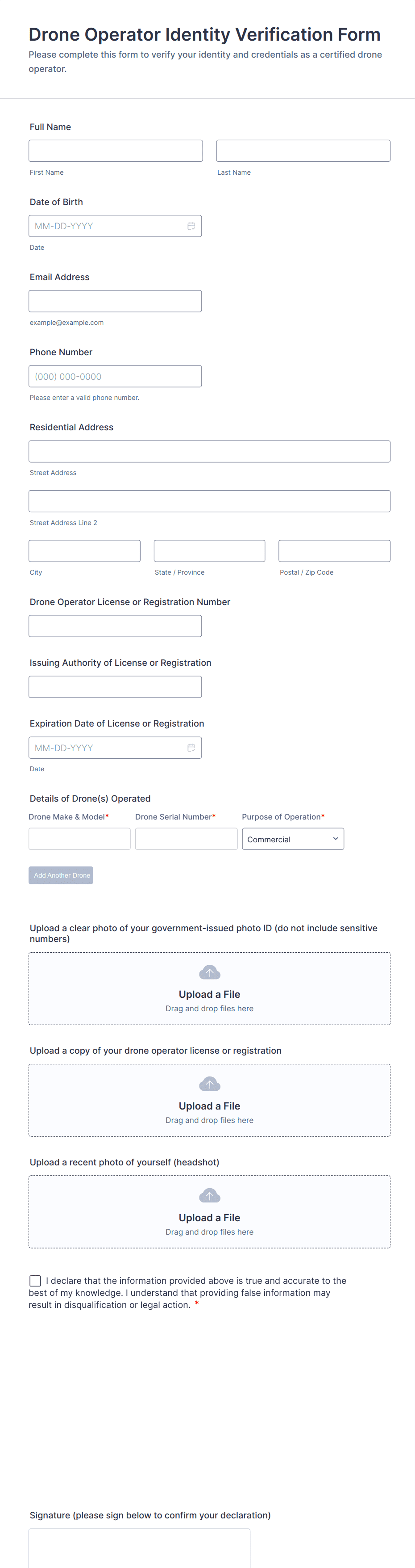 • For verification, include fields for uploading documents (e.g., ID, proof of address, certificates).