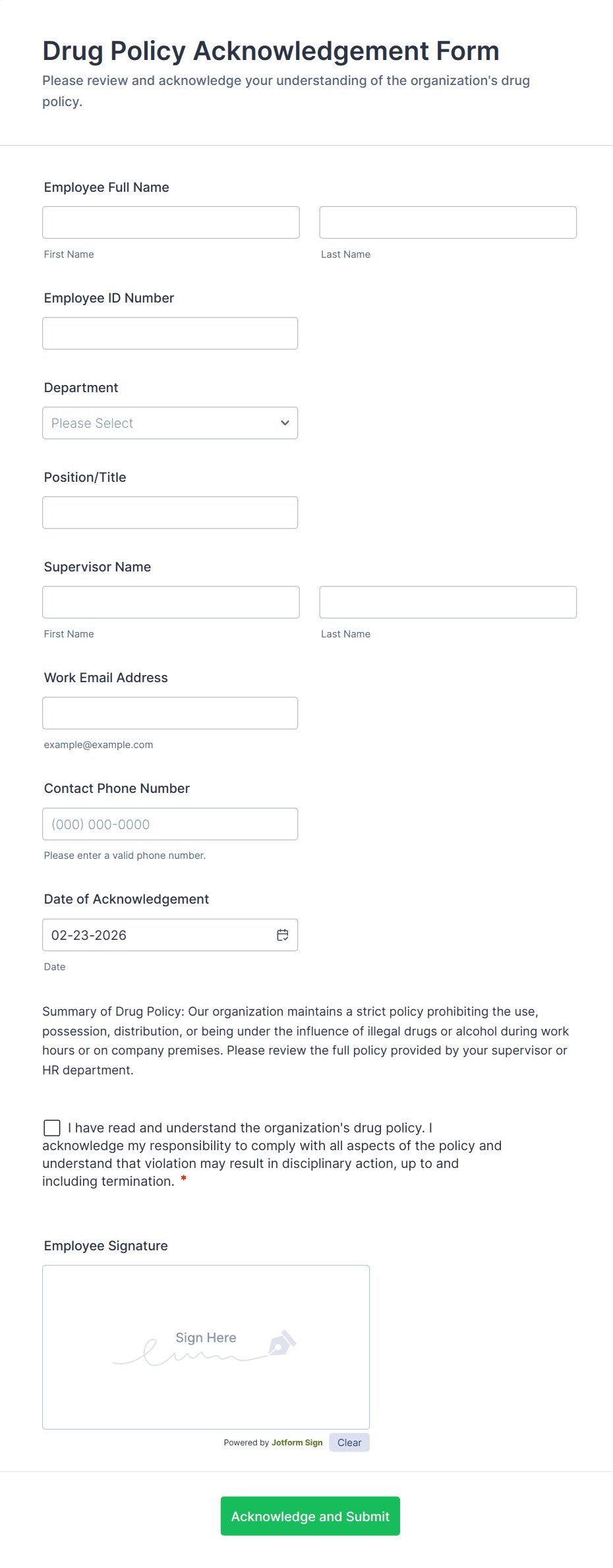 • Checkboxes for agreement and acknowledgment