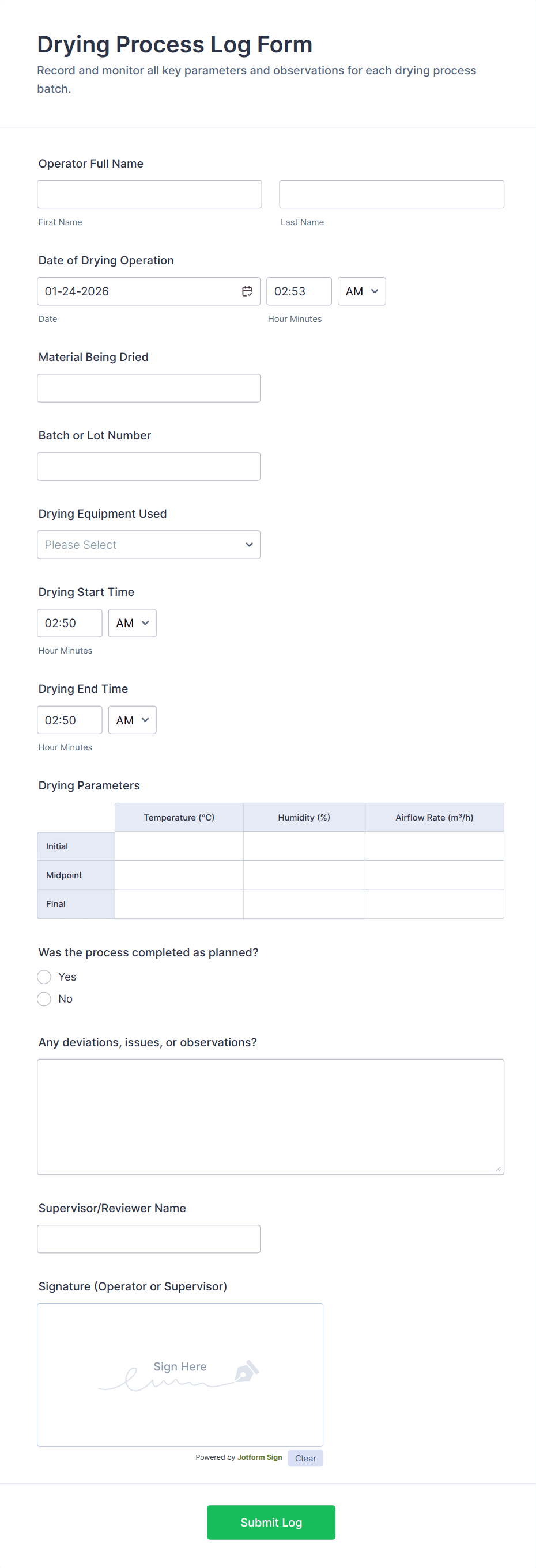 Production Log Form