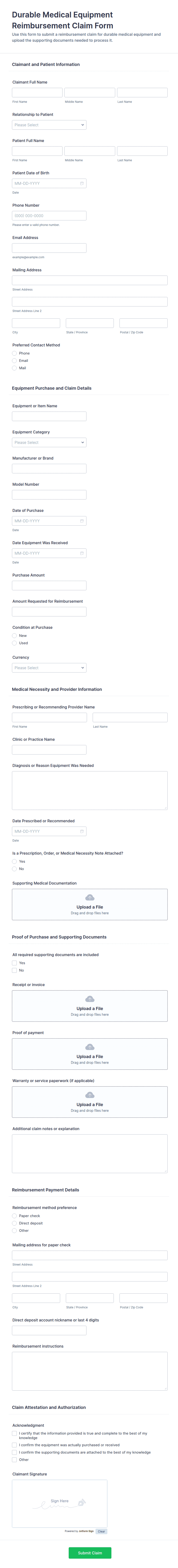 Include claimant and patient identification details, equipment and purchase information, and reimbursement preferences, and allow uploads for supporting medical documentation and proof of purchase so each form submission can be reviewed with the right context.