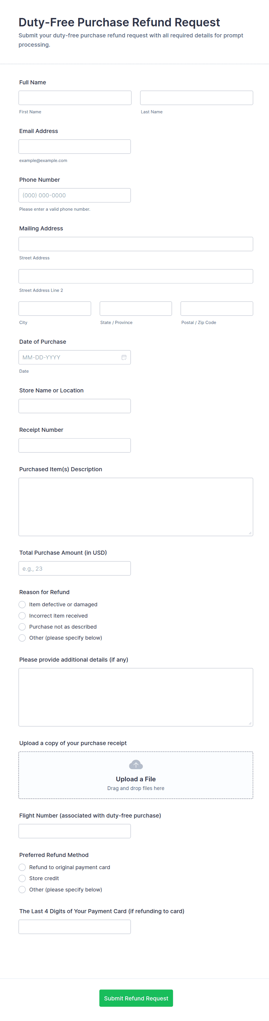 - E-commerce Refunds: May require order number, product details, reason for return, and upload fields for receipts or photos.