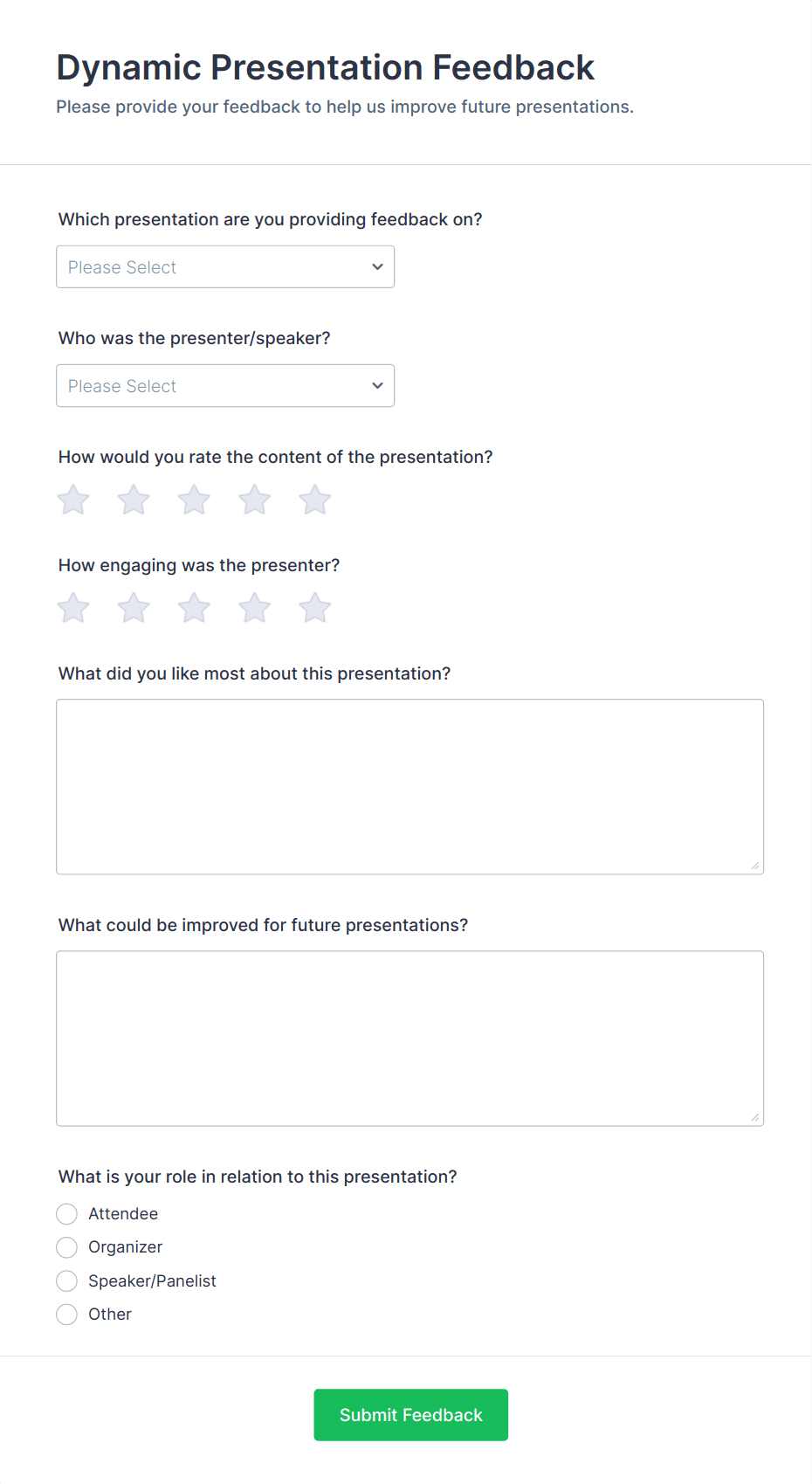 An event presenter feedback form is a survey used by presenters and planners to get customer feedback after an event.