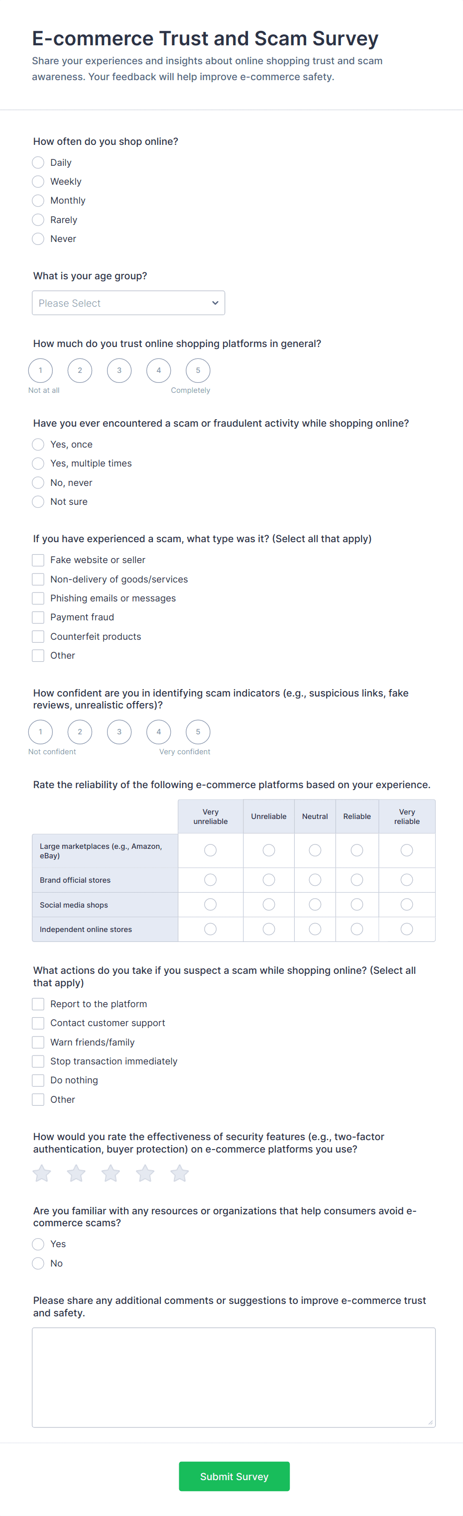 An online shopping survey is a questionnaire used by online stores to collect feedback from their customers. Whether you run a book, magazine, clothing, or furniture store, use this free Online Shopping Survey!