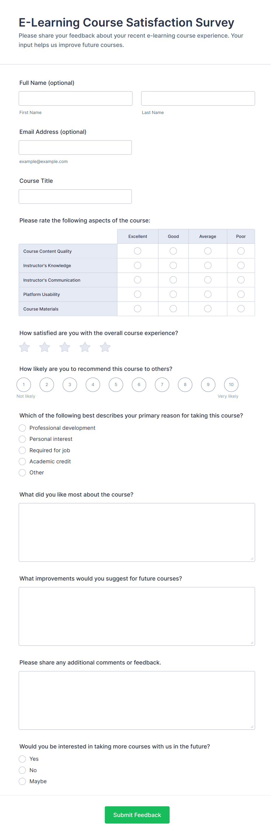 • Online course forms can ask about platform usability and digital resources.
