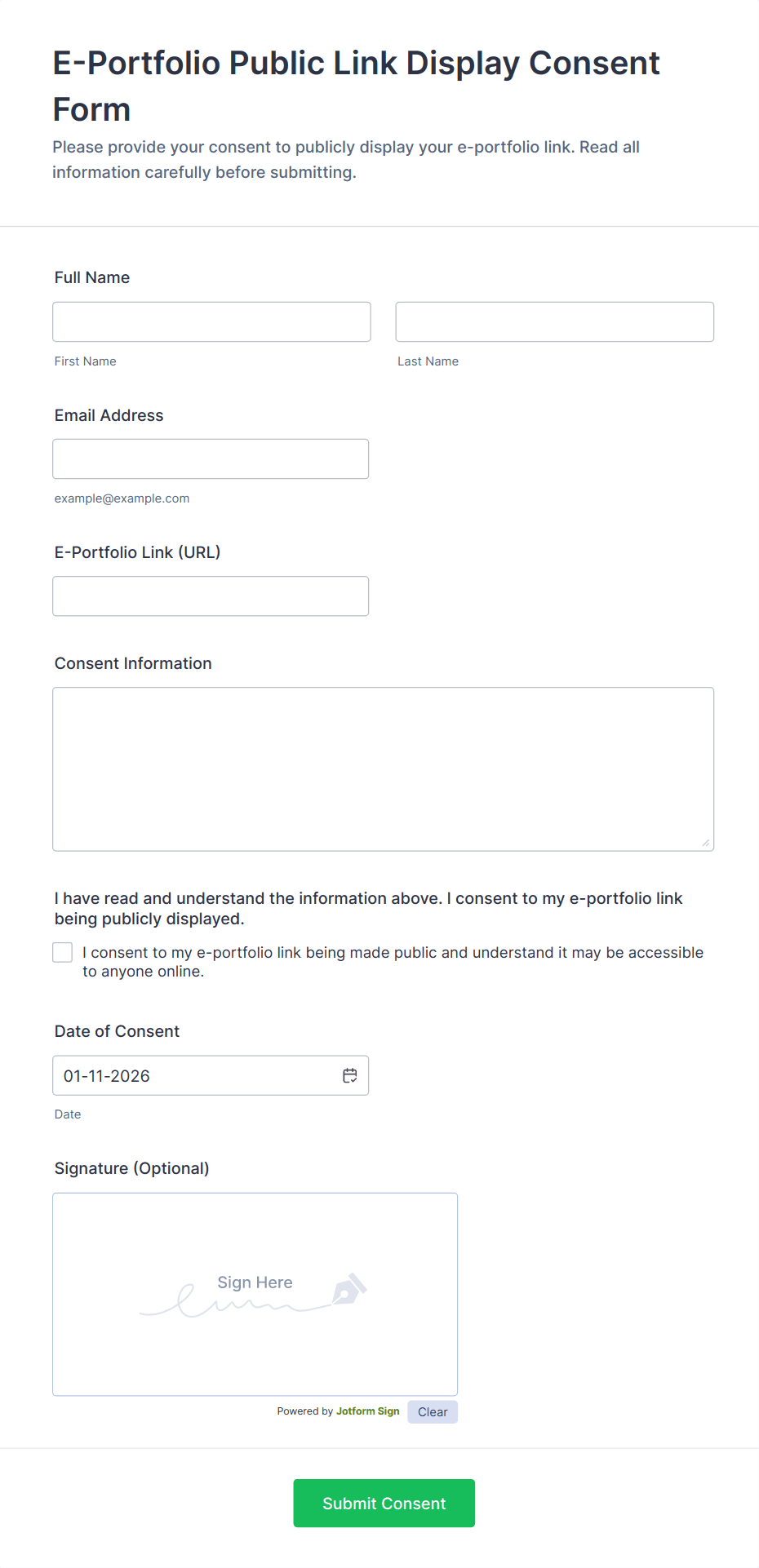 - Include specific fields for the type of information to be shared (e.g., photos, medical records, contact details).