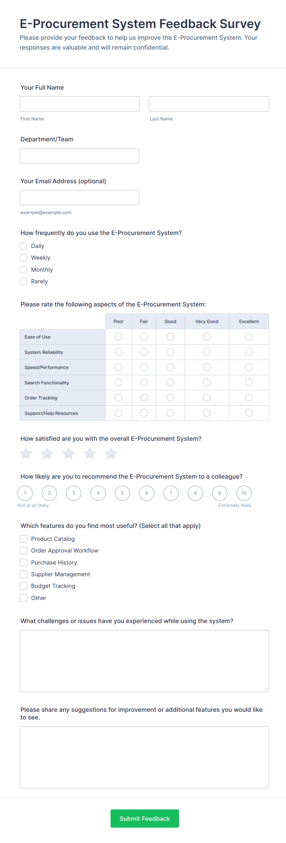 • For customer feedback, include questions about satisfaction, product quality, and likelihood to recommend.