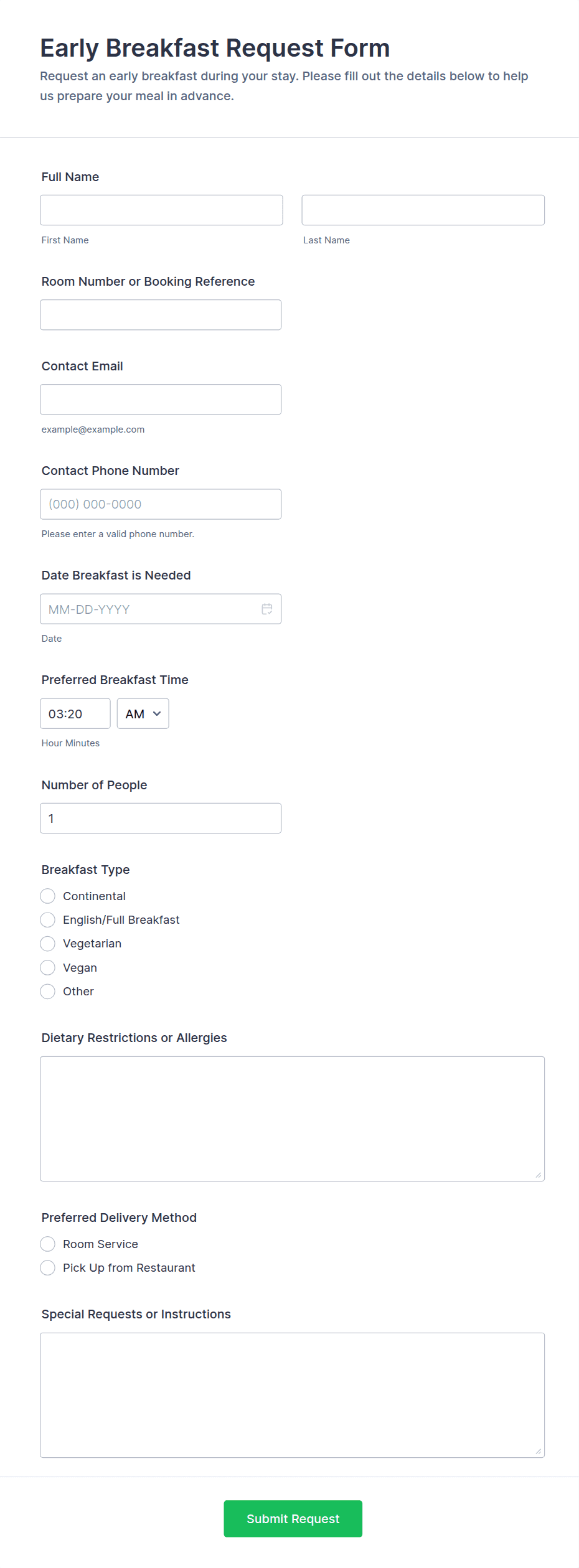 • Catering Requests: Require fields for event date, guest count, menu packages, special instructions, and contact information.