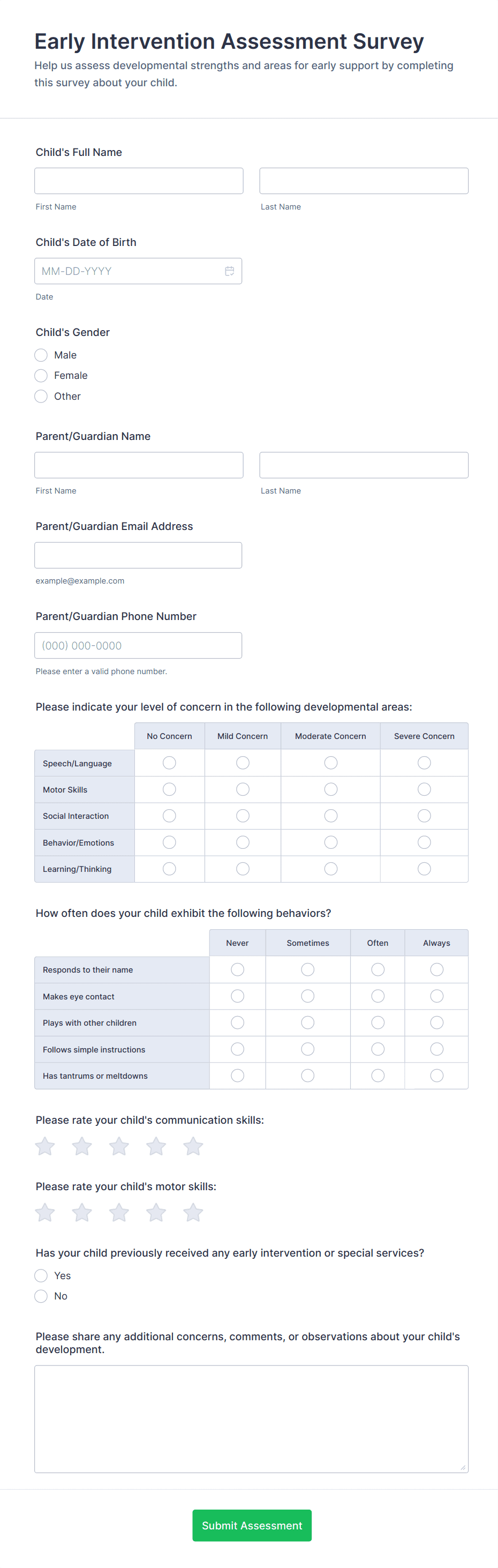 Assessment Form Templates are pre-designed digital forms used to evaluate, measure, or analyze knowledge, skills, performance, or other criteria across a variety of settings. These templates are commonly utilized in education for student assessments, in the workplace for employee evaluations, in healthcare for patient screenings, and in many other fields where structured feedback or data collection is essential. Assessment forms can range from simple quizzes and self-assessments to complex multi-section evaluations, making them versatile tools for gathering actionable insights and supporting decision-making processes.