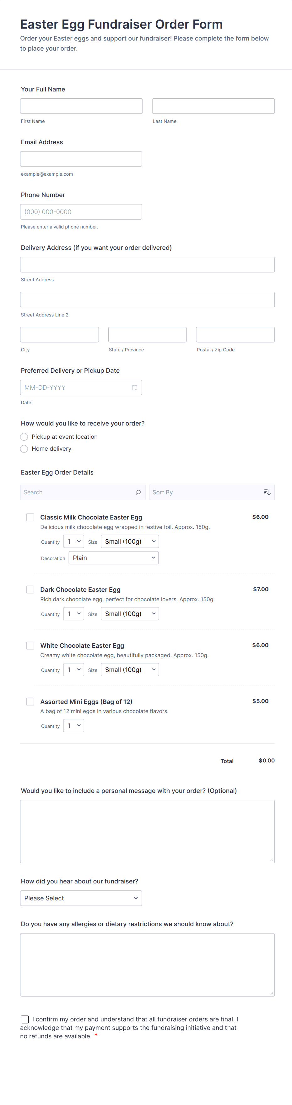 - Custom Campaigns: Fields can be added or removed based on the specific needs of the fundraiser, such as delivery addresses or special instructions.