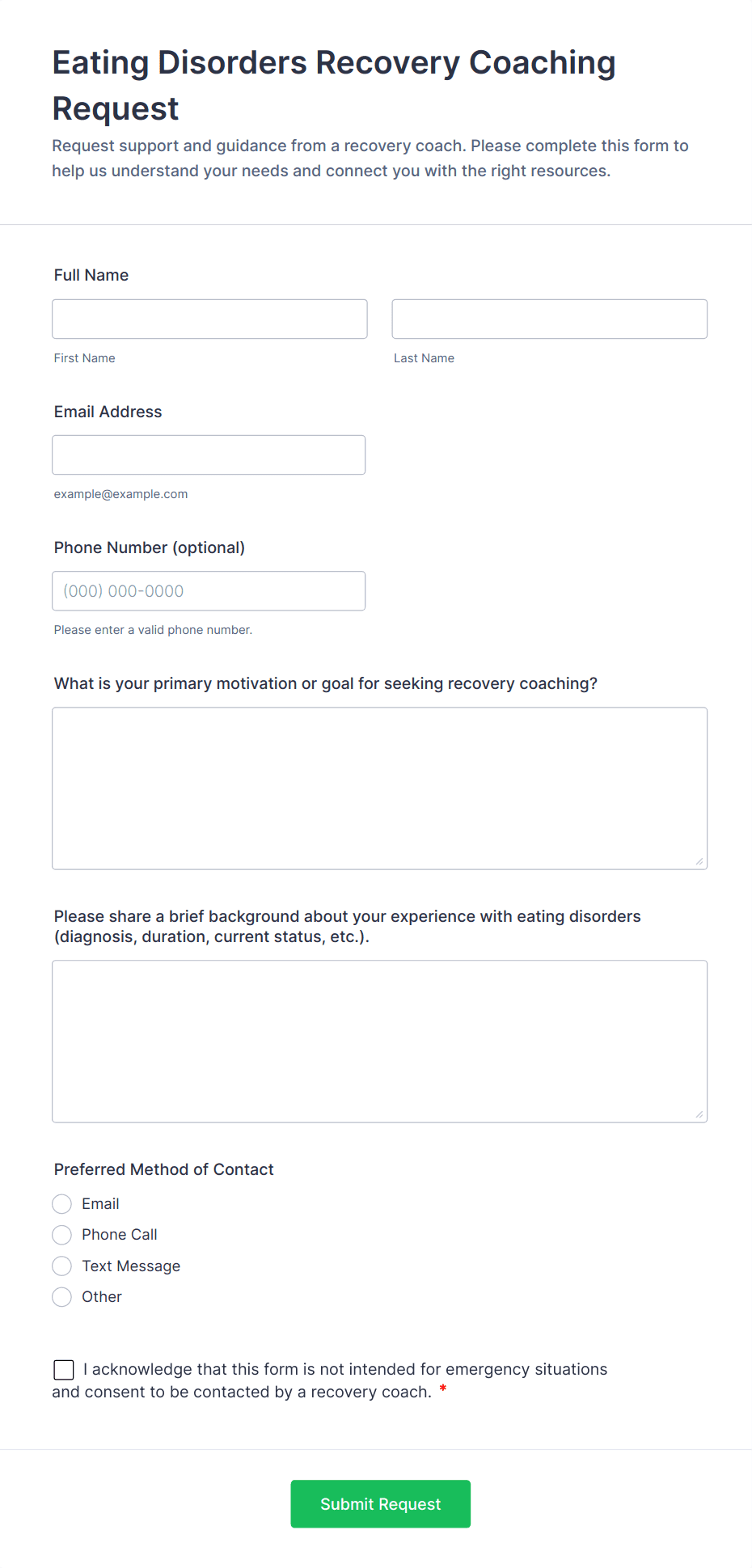 Are you a health coach looking for a convenient way to gather information from your patients? Streamline your intake process with these free Health Coach Forms from Jotform. Choose a form template below to start collecting responses from questionnaires, surveys, and patient health assessments from any device. Customize your forms without any coding with Jotform’s intuitive form builder. Simply drag and drop to add form elements, edit text fields and checklist items, upload your personal branding, and much more. Go paperless and securely collect and store patient data online with a fully-customizable Health Coach Form.