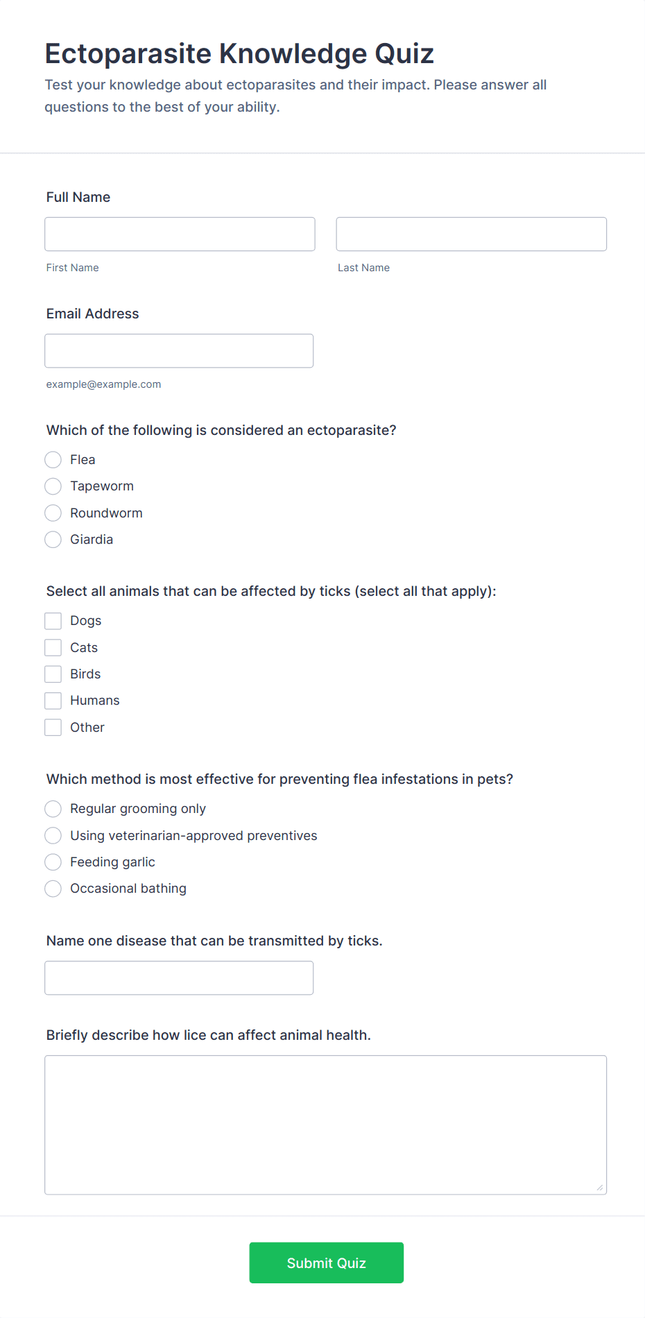 Quiz Templates are pre-designed forms specifically created to facilitate the process of building quizzes for a variety of purposes, such as education, employee training, lead generation, event engagement, and more. These templates provide a structured way to present questions, collect answers, and automatically score or evaluate responses. Whether you’re a teacher assessing student knowledge, a business running a product knowledge test, or a marketer creating a fun personality quiz, Quiz Templates offer a flexible foundation to suit your needs. They can be used for online exams, trivia games, onboarding assessments, customer feedback quizzes, and interactive learning modules.