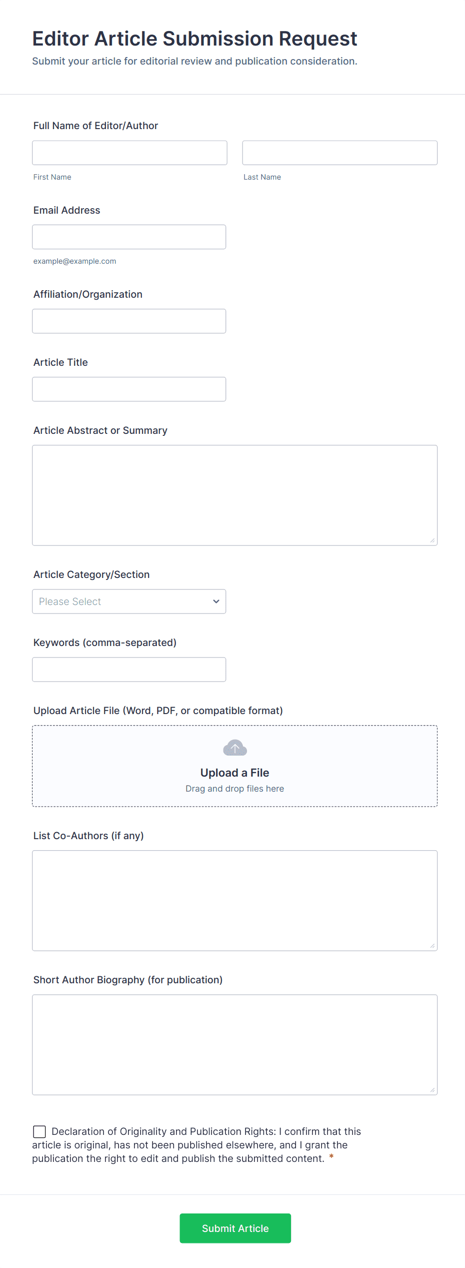 • Editorial submission forms may require fields for author bio, article title, and file uploads
