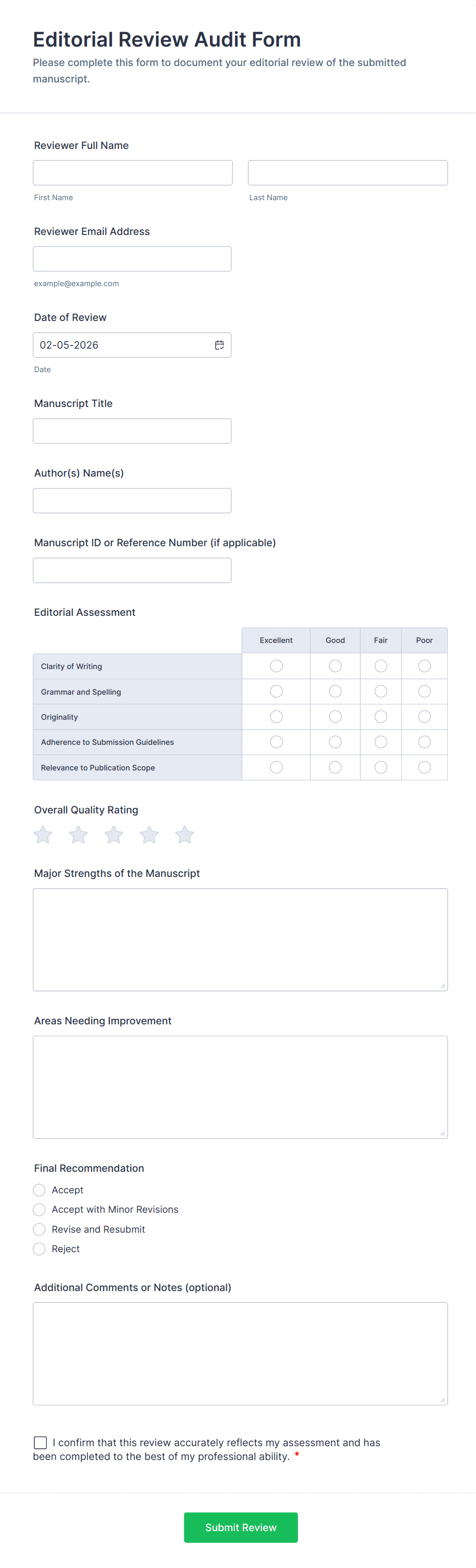 - Internal Reviews: May use open-ended questions, scoring systems, and workflow approval fields.
