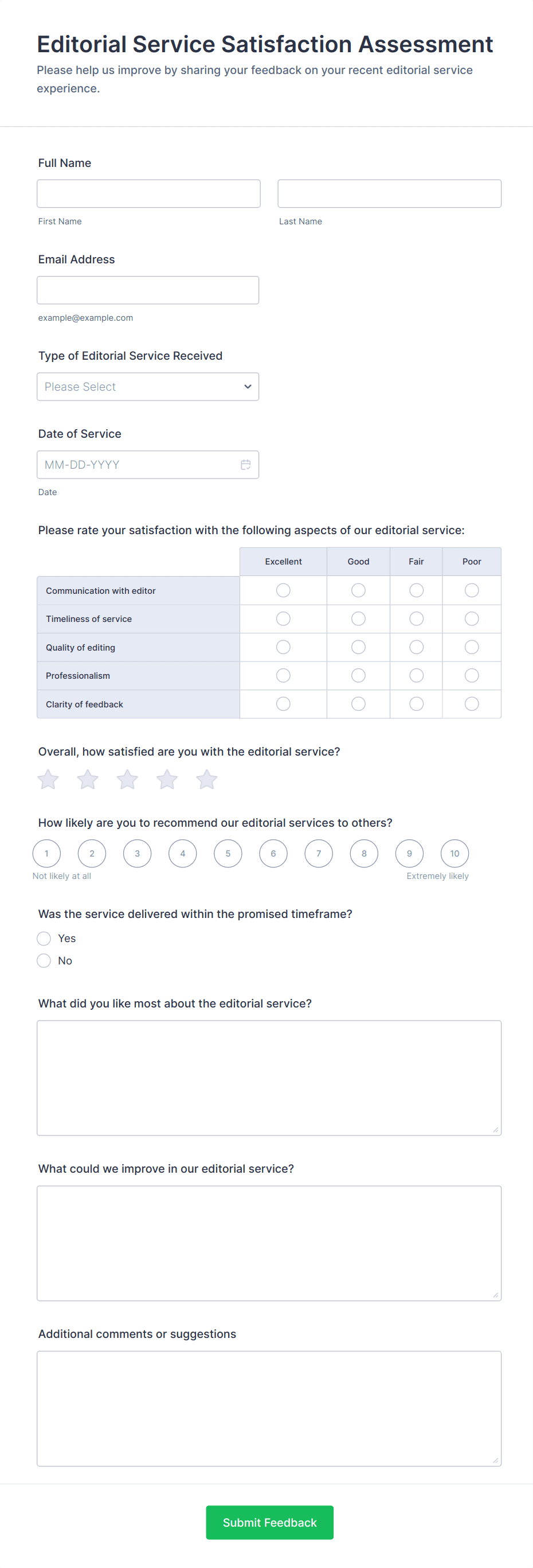 • Ongoing satisfaction forms might focus on overall service quality, communication, and responsiveness