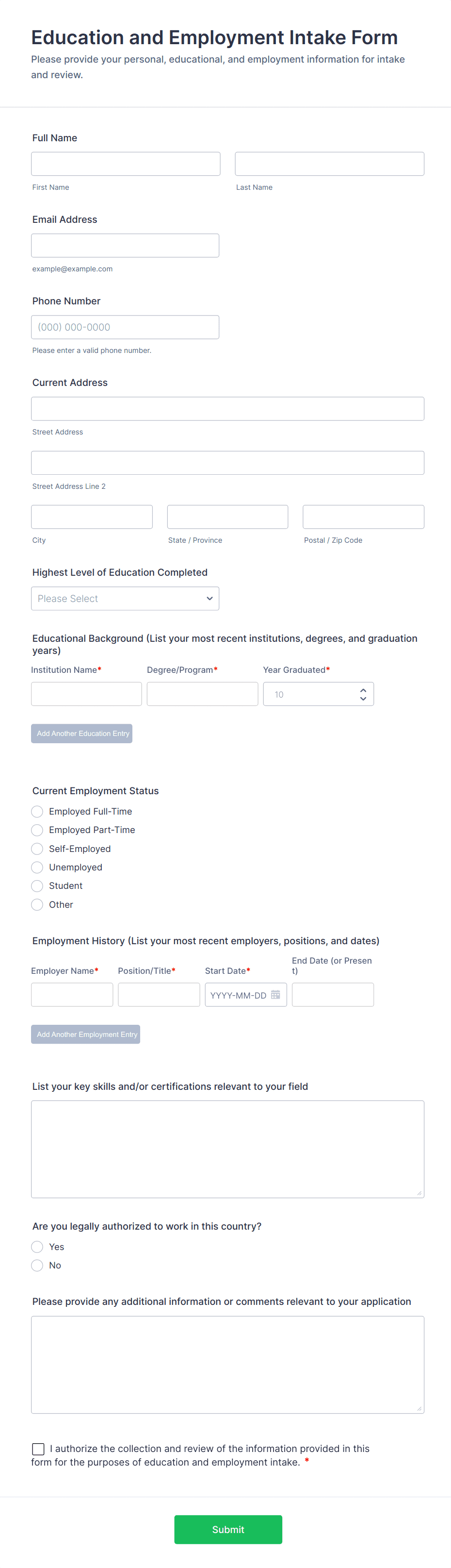 Intake forms are essential tools used to gather preliminary information from clients, patients, customers, or participants before providing a service or beginning a process. These forms streamline the onboarding process by collecting relevant details such as contact information, background data, preferences, and specific needs. Intake forms are widely used across various industries, including healthcare (patient intake), legal (client intake), education (student intake), human resources (employee onboarding), and service-based businesses (client consultations). By standardizing the information-gathering process, intake forms help organizations ensure consistency, improve efficiency, and deliver personalized experiences.