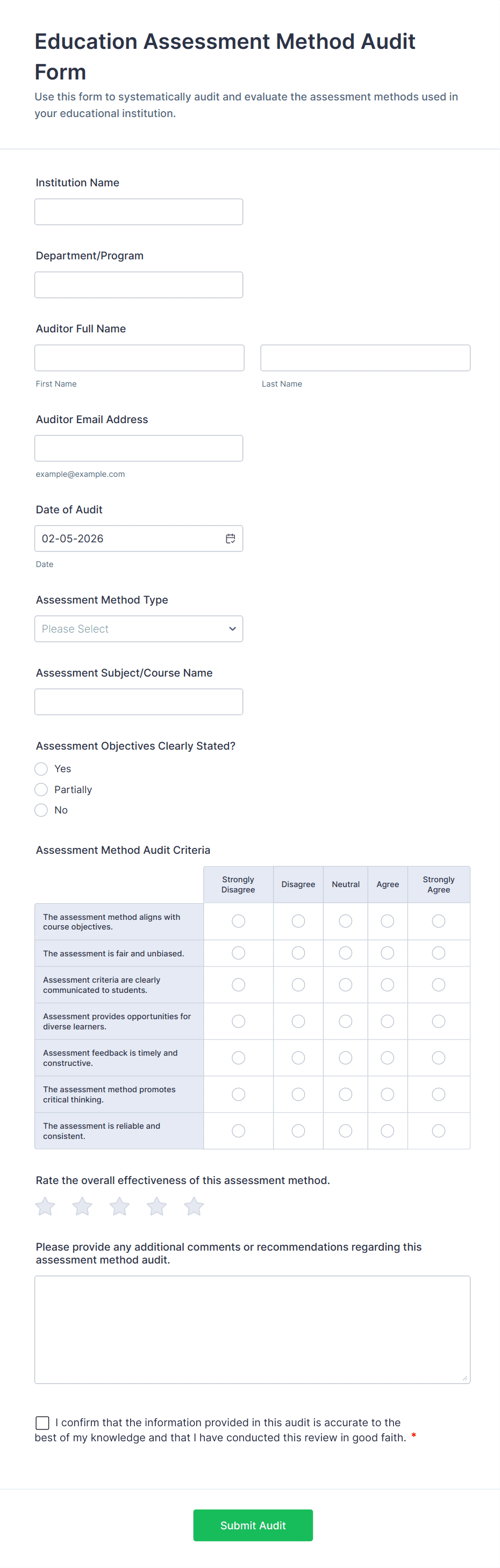 Assessment forms may include personal details, multiple-choice or open-ended questions, rating scales, comment sections, and sometimes automated scoring or feedback fields, depending on the purpose.