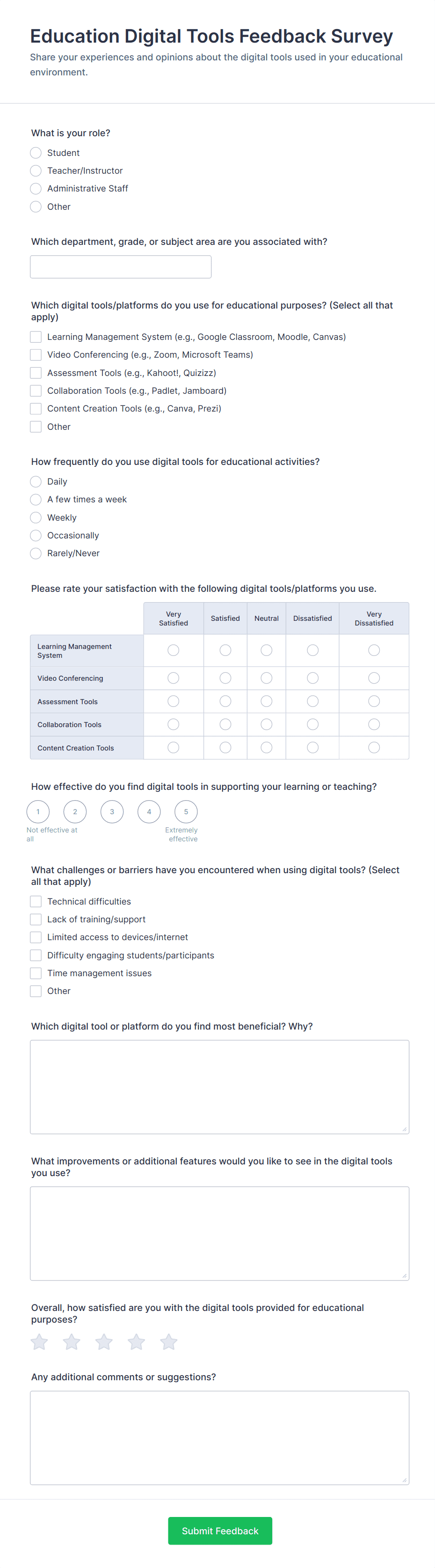 Typical fields include demographic information, technology usage patterns, satisfaction ratings, open-ended feedback, and specific questions about software, hardware, or digital skills.