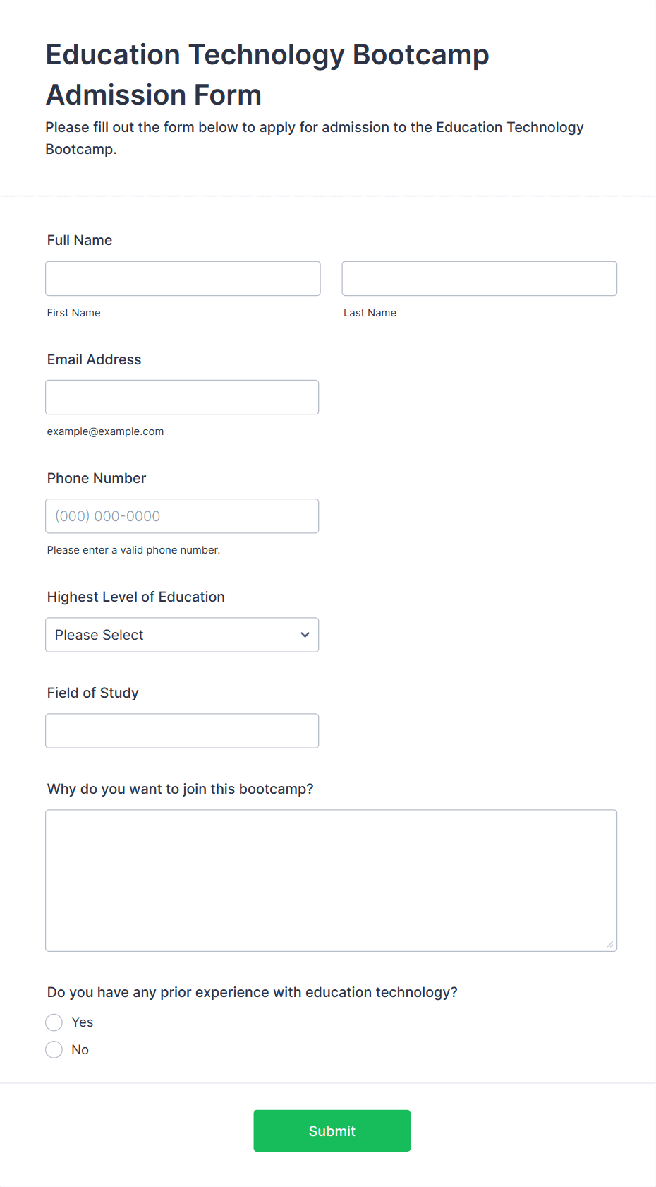 • For job applications, include fields for personal information, education, work experience, references, and file uploads for resumes or cover letters.