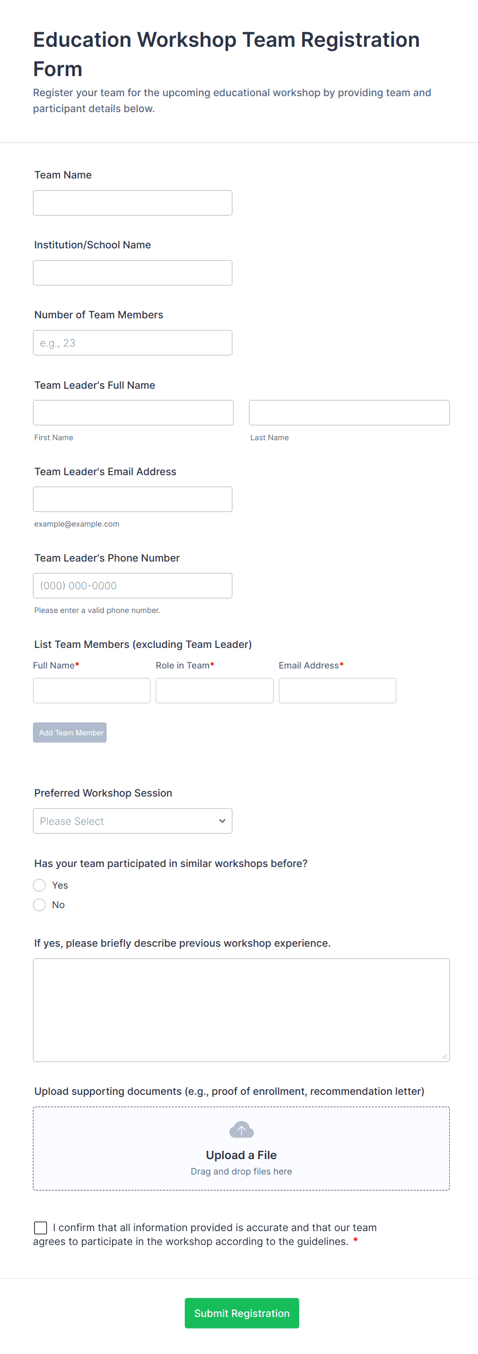 By following these steps, you can create a professional, user-friendly Workshop Registration Form that streamlines the sign-up process, reduces administrative work, and enhances the overall experience for your participants.