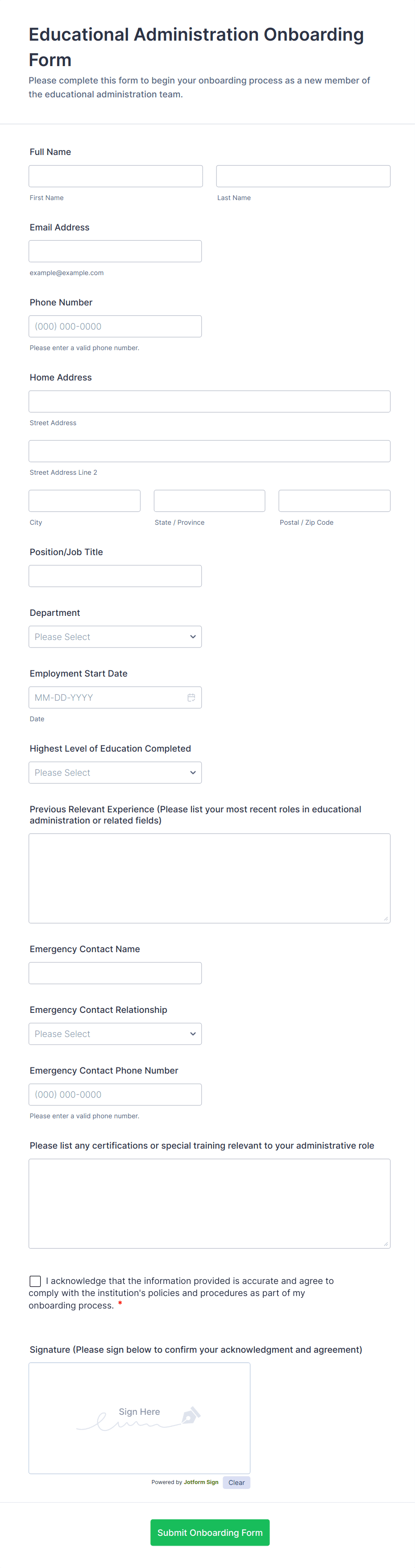 - Employee onboarding: May require fields for personal details, tax forms, emergency contacts, and policy acknowledgments.