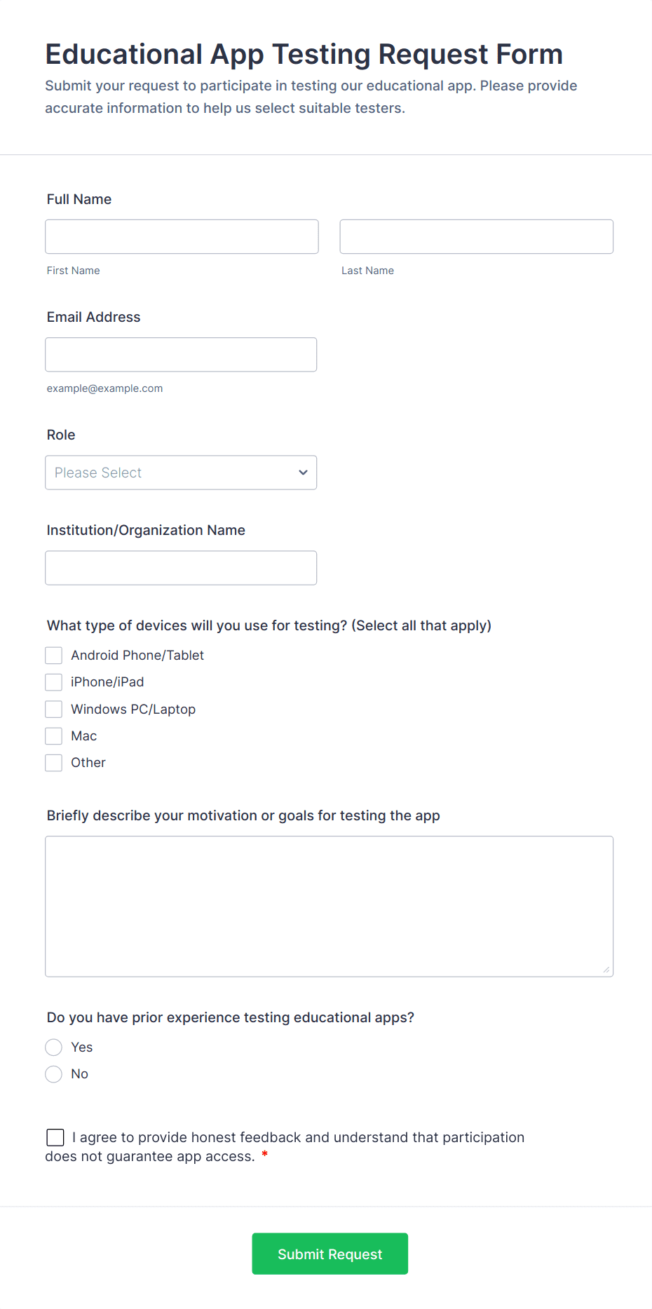Request forms are essential tools for gathering and organizing information when someone needs to ask for something — whether it’s a service, resource, approval, or support. These forms streamline the process of submitting and managing requests in a wide range of scenarios, such as equipment requests, maintenance requests, time-off requests, IT support, purchase orders, facility bookings, and more. By providing a standardized way to collect all necessary details, request forms help organizations ensure that every request is clear, trackable, and actionable, reducing miscommunication and delays.