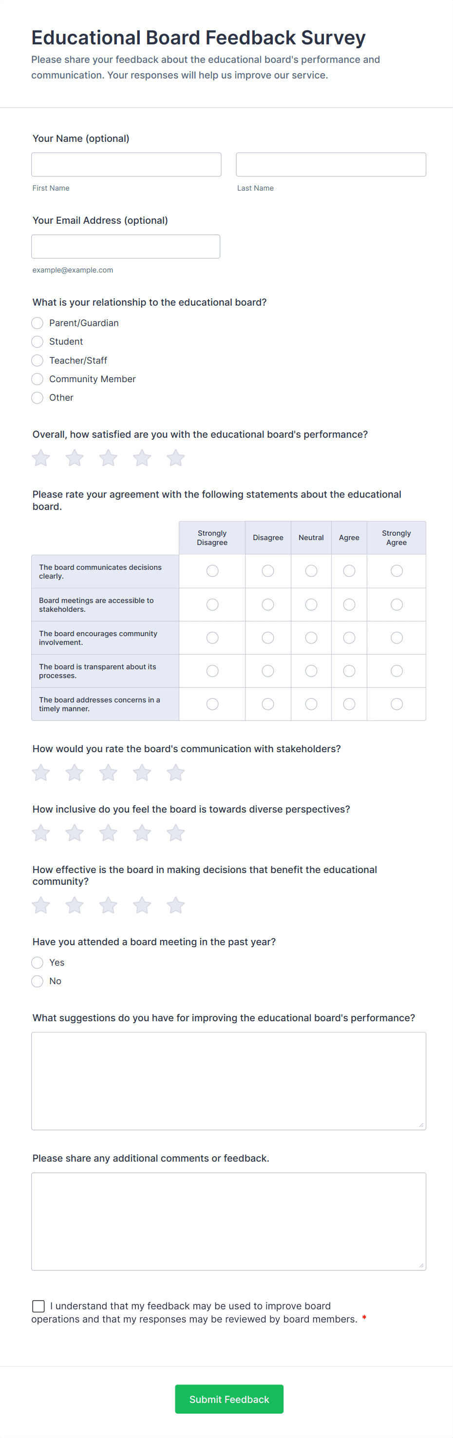 - For teacher or staff surveys: Include self-assessment fields, peer review sections, and narrative response options.